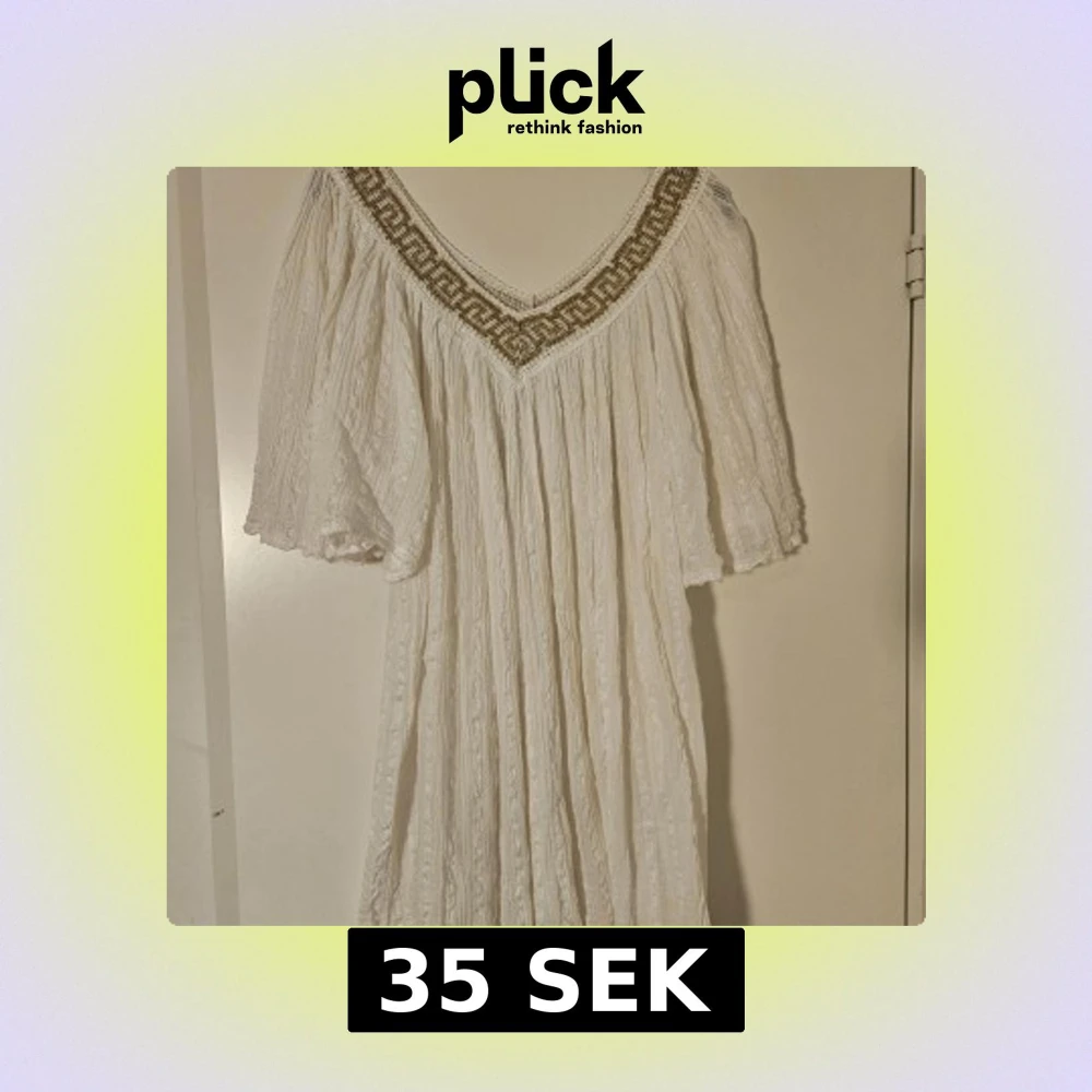 Luftig vit strandklänning med v-ringning och breda ärmar. Klänningen har ett guldfärgat broderi längs halsringningen. Onesize men lösare modell som nog passar många