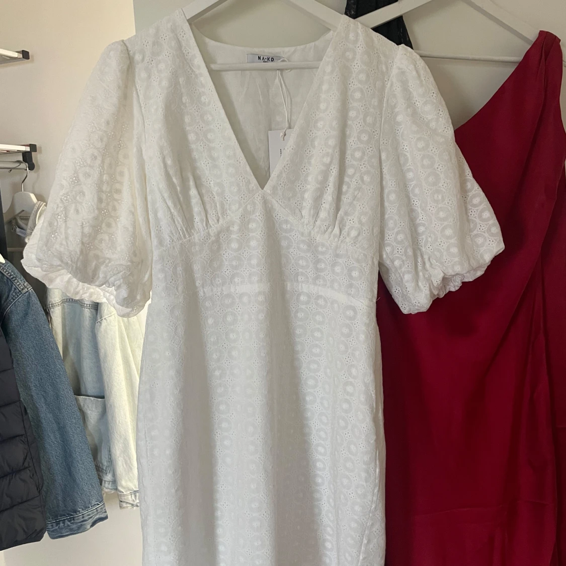 Säljer en vit klänning klänning från NAKD! I stolek 40 men sitter mer som en 38. Uppsydd så den passar mig som är 165 cm. Helt oanvänd och köpt för 800 kr 🩷🩷
