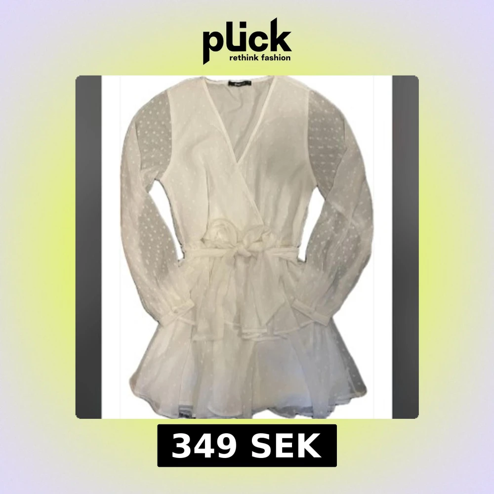Superfin vit kort volangklänning från Gina Tricot med knyt i midjan, långärmade transparenta ärmar med diskret prickigt mönster och v-ringning. Perfekt för student/kalas/avslutningar eller sommarens alla tillfällen!