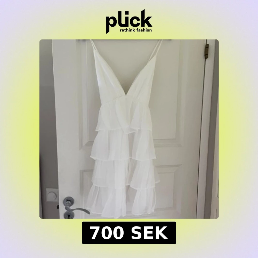 Min studentklänning! Supersöt vit kortklänning från Lulus med flera lager volanger och smala axelband. Djup v-ringning fram och korsade band bak. Endast använd under studentdagen. Nypris 1300