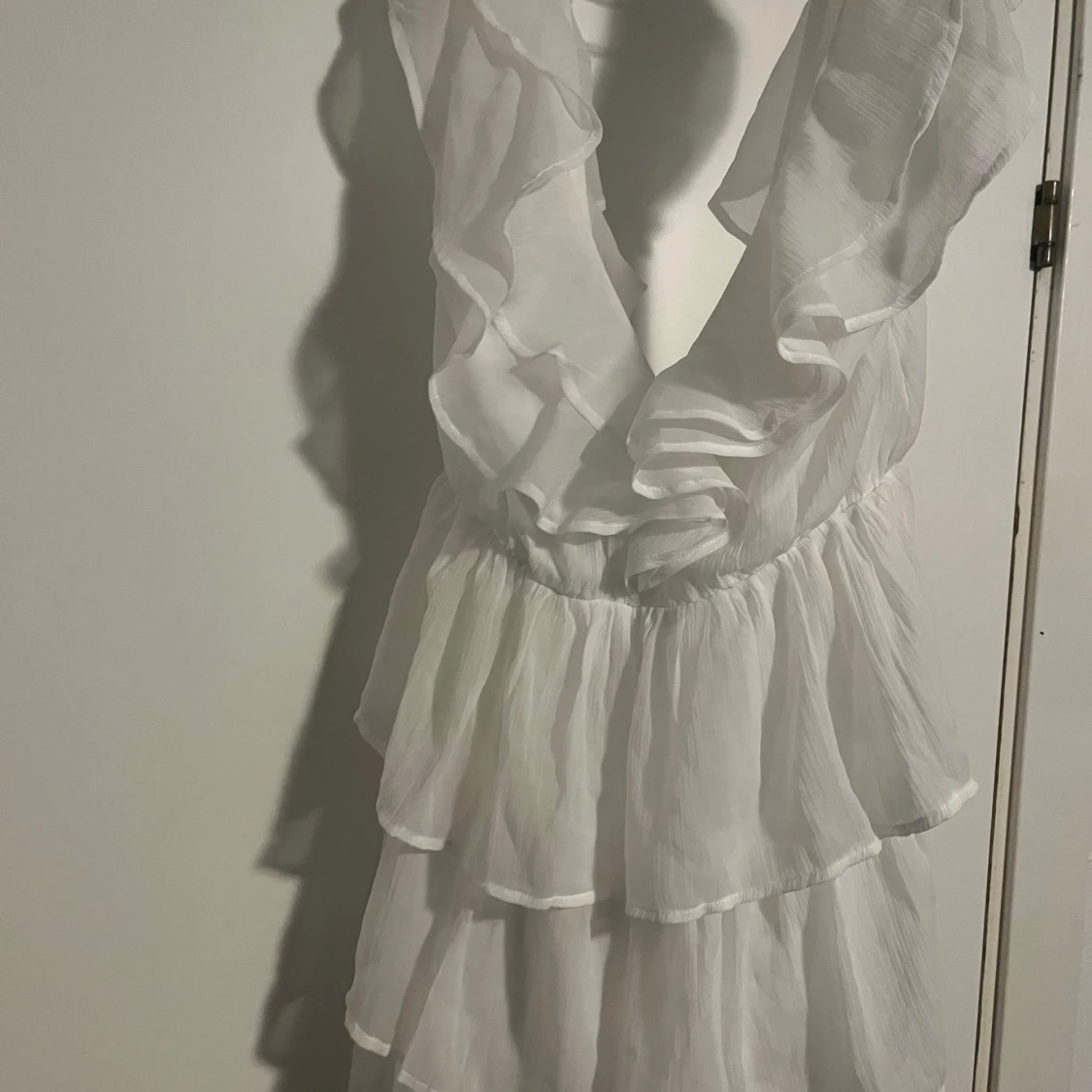 Superfin vit kortklänning från NLY Eve med flera lager volanger och djup v-ringning. Klänningen har en luftig känsla och är perfekt för sommarens alla tillfällen. Snygg omlott-look upptill och markerad midja för en feminin siluett.