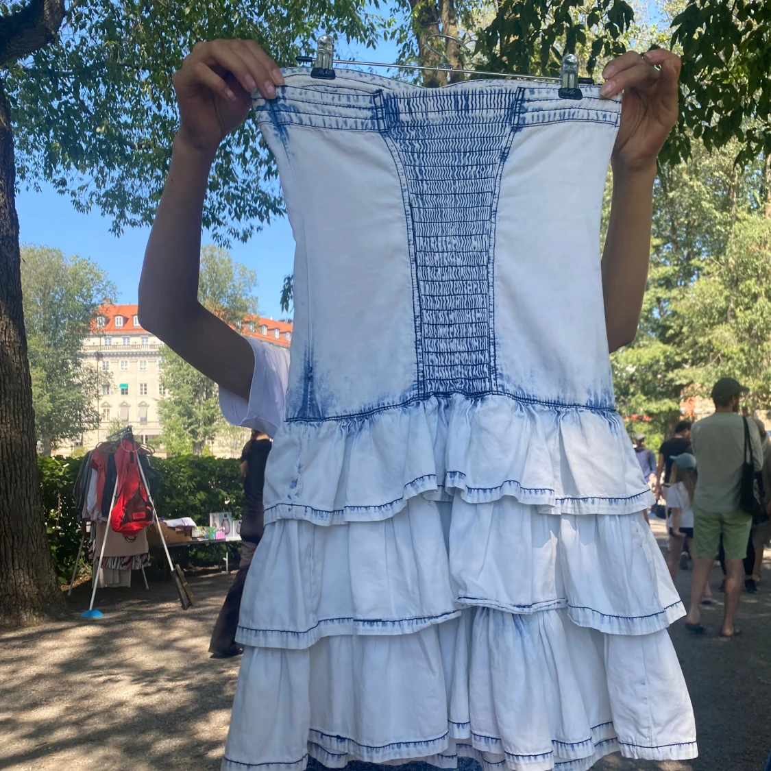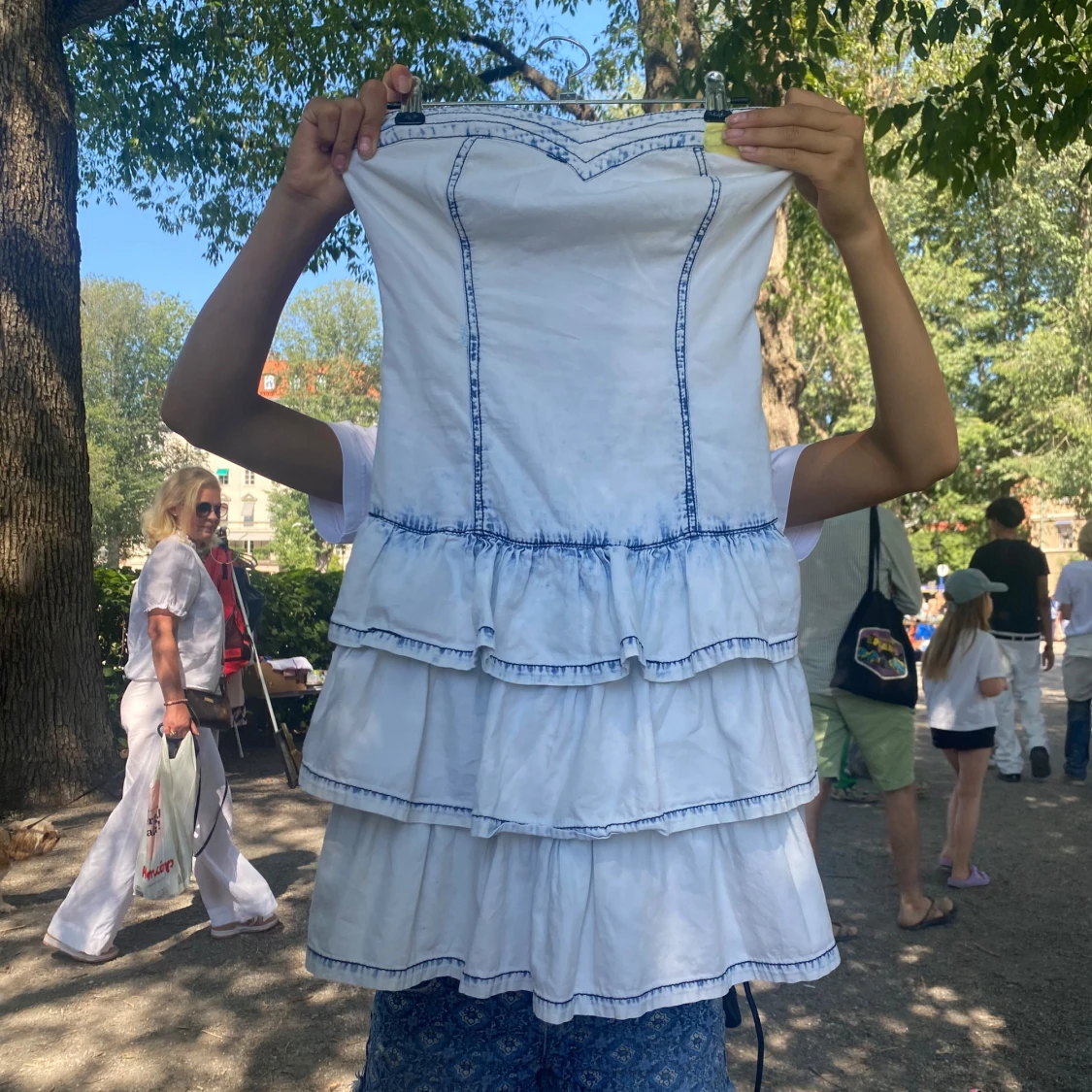 Supersöt kort klänning i vitt med blå kontrastsömmar och flera volanglager. Axelbandslös modell med smockad rygg för extra komfort. Perfekt för varma dagar och ger en riktigt somrig vibe.