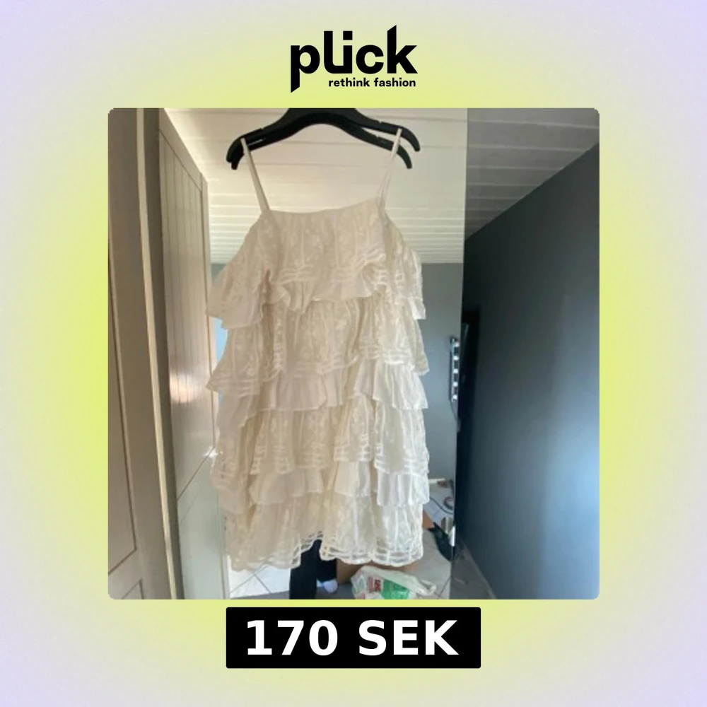 Supersöt vit kortklänning med tunna axelband och flera lager volanger. Klänningen har fina spetsdetaljer och ett romantiskt uttryck, perfekt för sommarens alla tillfällen. Lätt och luftig känsla med snygg struktur i tyget🥰