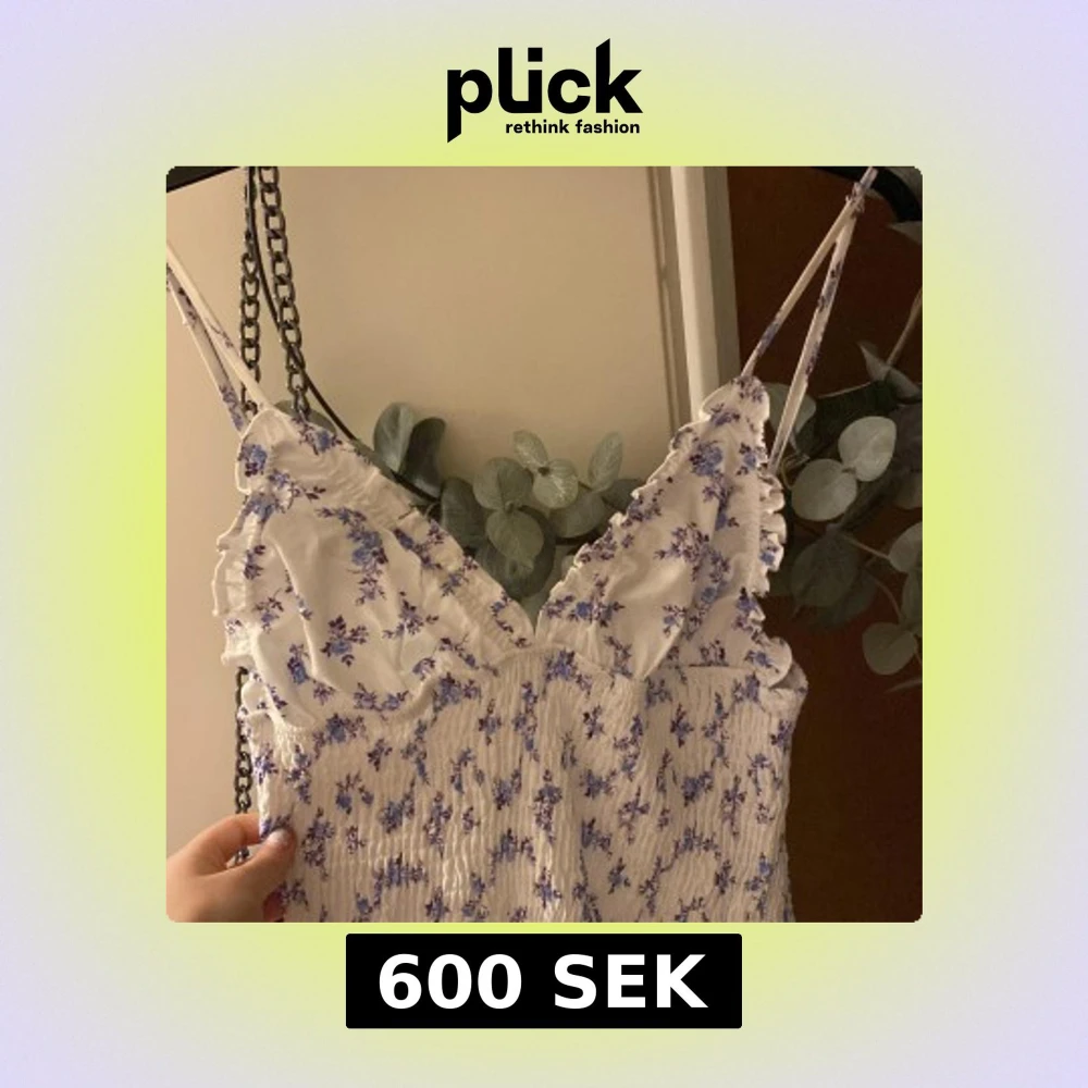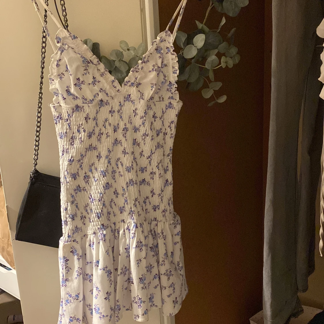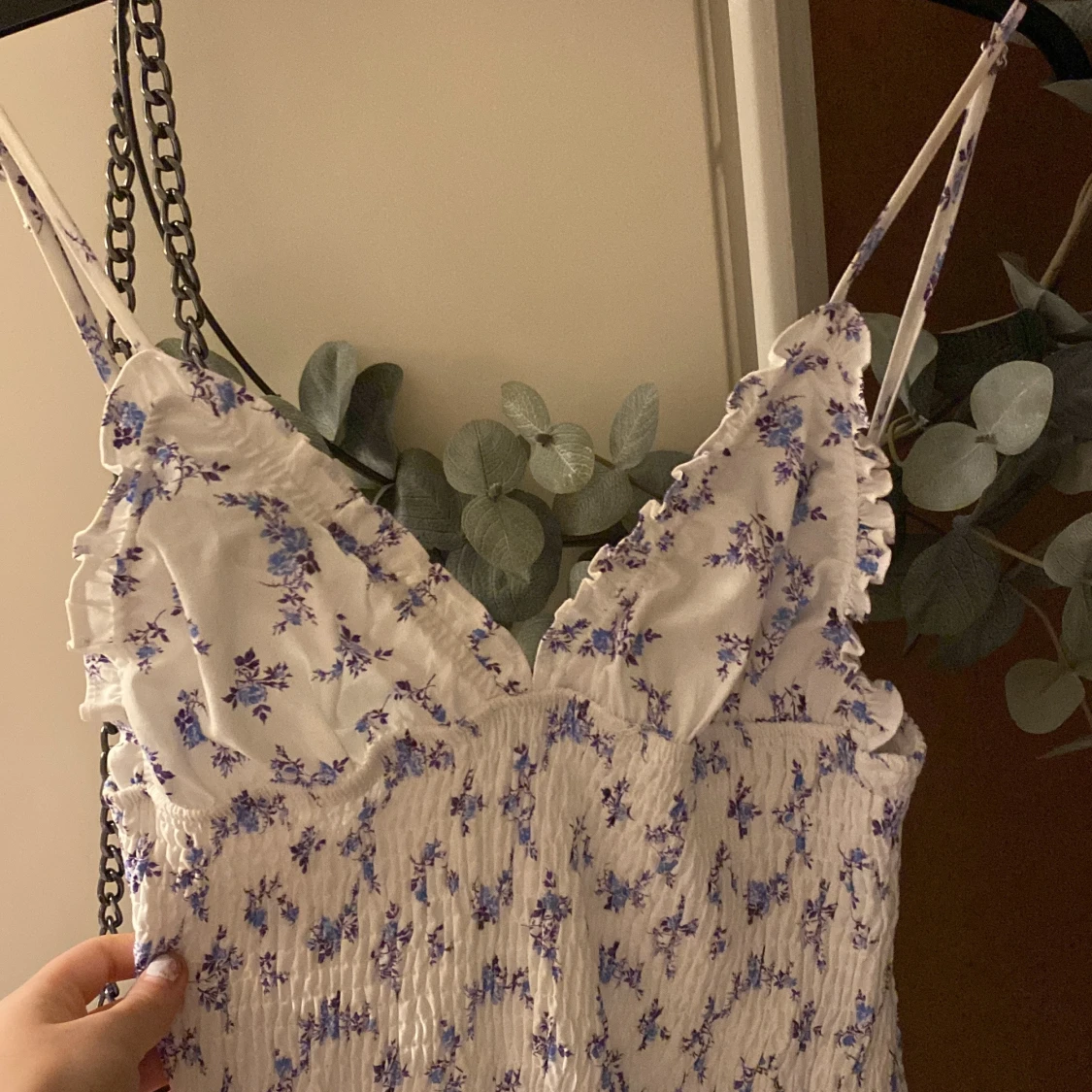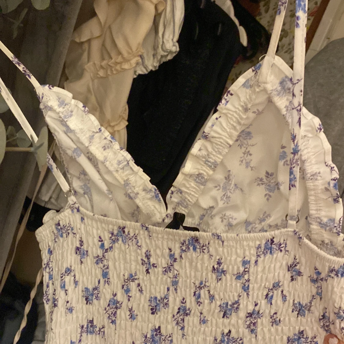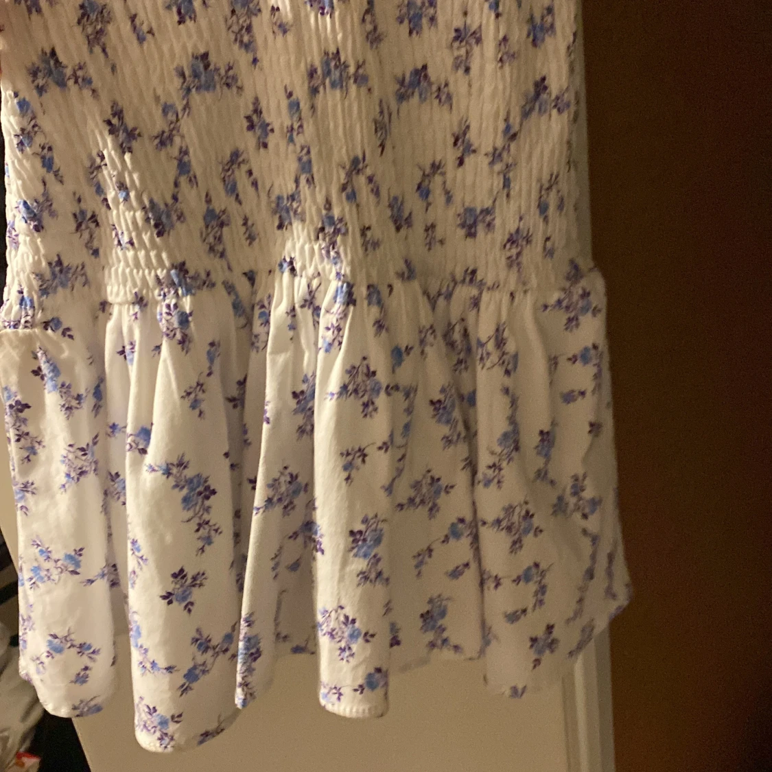 Supersöt populär Zara vit kortklänning med blått och lila blommönster, smala axelband och volangdetaljer vid bysten. Klänningen har smockad överdel och lätt utställd kjol, perfekt för varma dagar. Materialet känns lätt och luftigt. Materialet drar sig efter midjan som gör att det ser ännu bättre ut