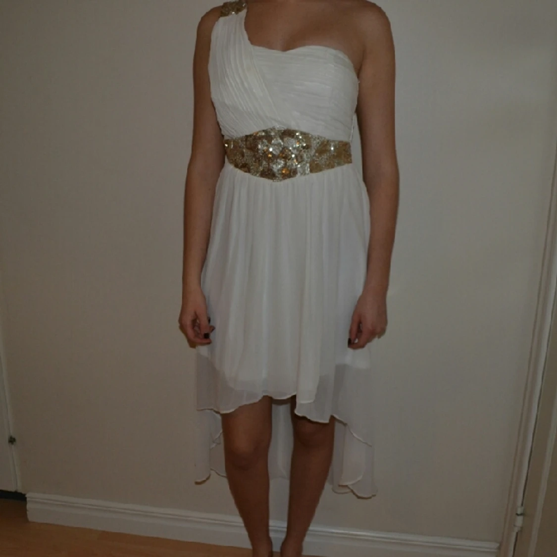 Vit chiffongklänning i high to low modell, gudliga paljett/glitter detaljer i midja och på axel. Storlek 38, men passar även på mig som vanligtvis är 36. Använd en gång, nyskick!