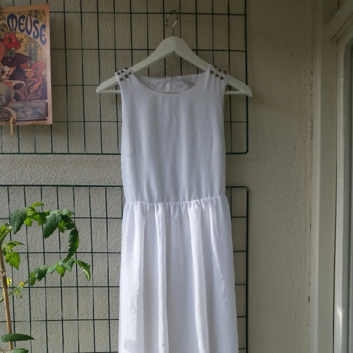 Jättevacker vit sommarklänning som knappt använts sedan studenten- synd tycker jag! Lagad i ryggen (syns på sista bilden) men det märks knappt. Väldigt bekvämt stretchig!