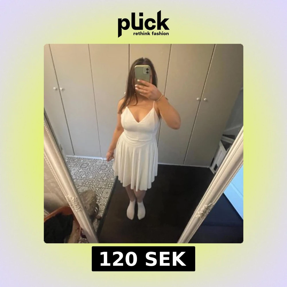 Säljer en söt vit kortklänning med smala axelband och v-ringning. Klänningen har en öppen rygg med korsade band och en fladdrig kjol. Perfekt för sommarens varma dagar!