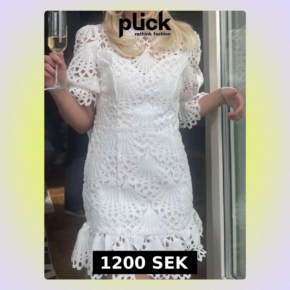 Superfin vit klänning med broderade detaljer och hålmönster. Klänningen har puffärmar, volangkant nertill och rund halsringning. Perfekt för somriga tillfällen och studentfirande. Materialet ser ut att vara bomull eller liknande tyg.