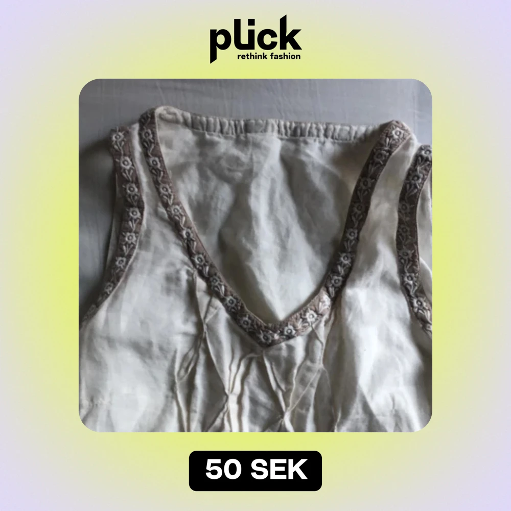 En klänning som blivit färgad med te vilket gett den en creme liknande färg. Fina detaljer och väldigt skönt linne-material. En liten fläck har den dock på framsidan