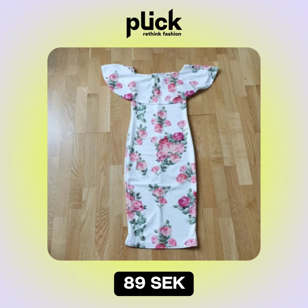 Vit off shoulder klänning med blom motiv. Använd en gång. Från Nelly. Passar perfekt till en skolavslutning eller event. Den är i storlek XS men den passar defentivt S och kanske pear shaped M då den är strechig.
