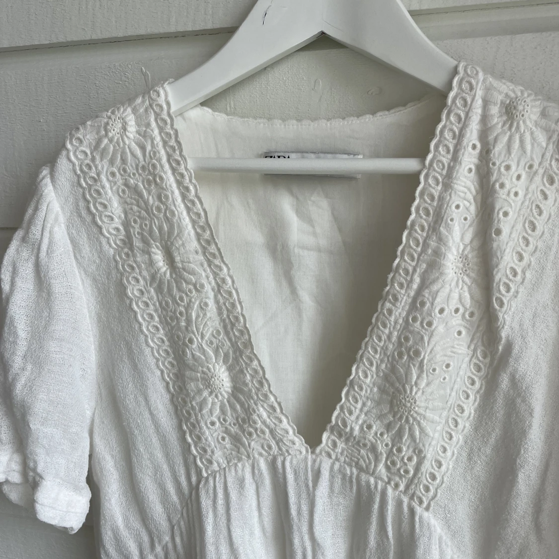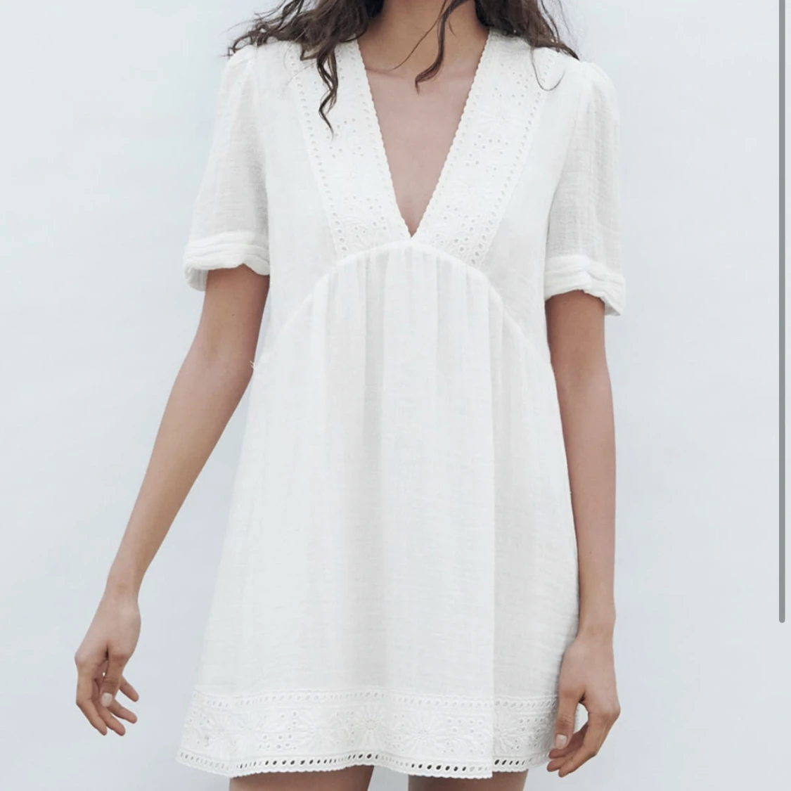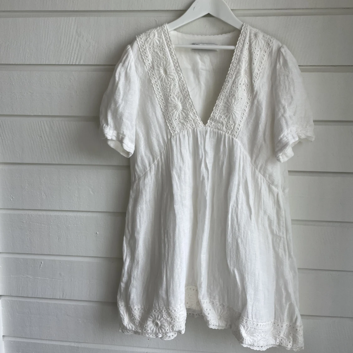 Säljer denna så fina vita klänningen i linne från Zara, den är i sparsamt skick då den knappt är använd 💗