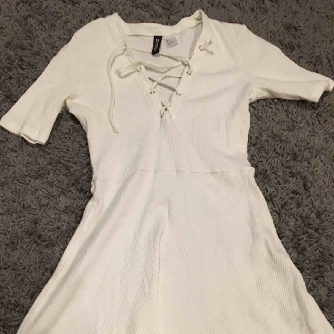 Vit klänning med korsning över brösten, räfflad i materialet.