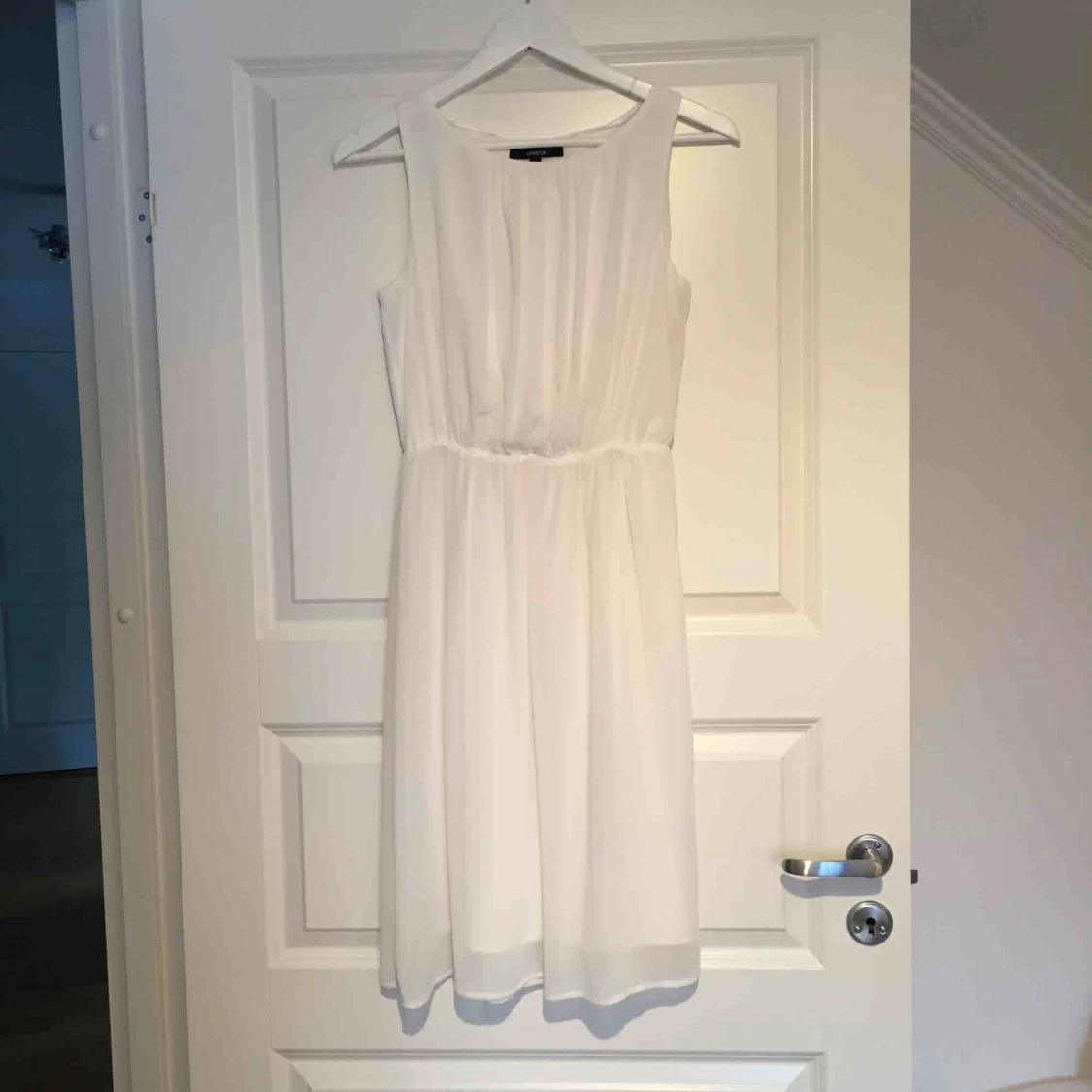 Vit klänning/avslutningsklänning Lite längre än knäna på mig som är 1.65 cm. Använd 1 gång Köparen står för frakt