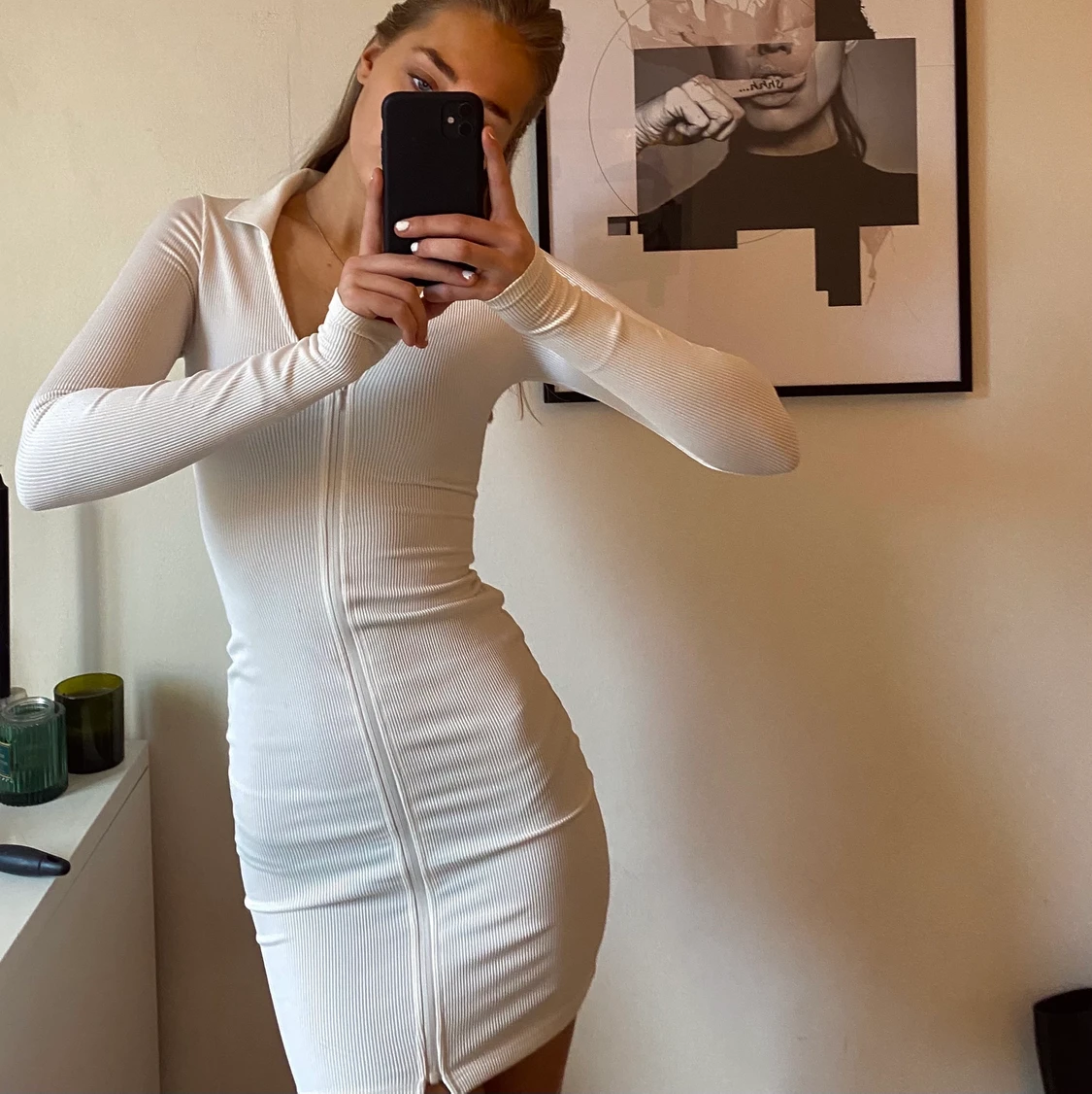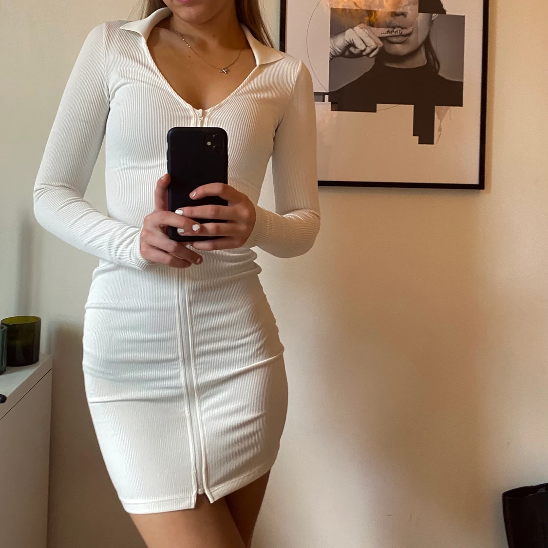 Säljer en jättefin vit klänning från H&M. Det han en cool krage och en dragkedja som går över hela framdelen. Den är ganska tajt, men väldigt stretchig.