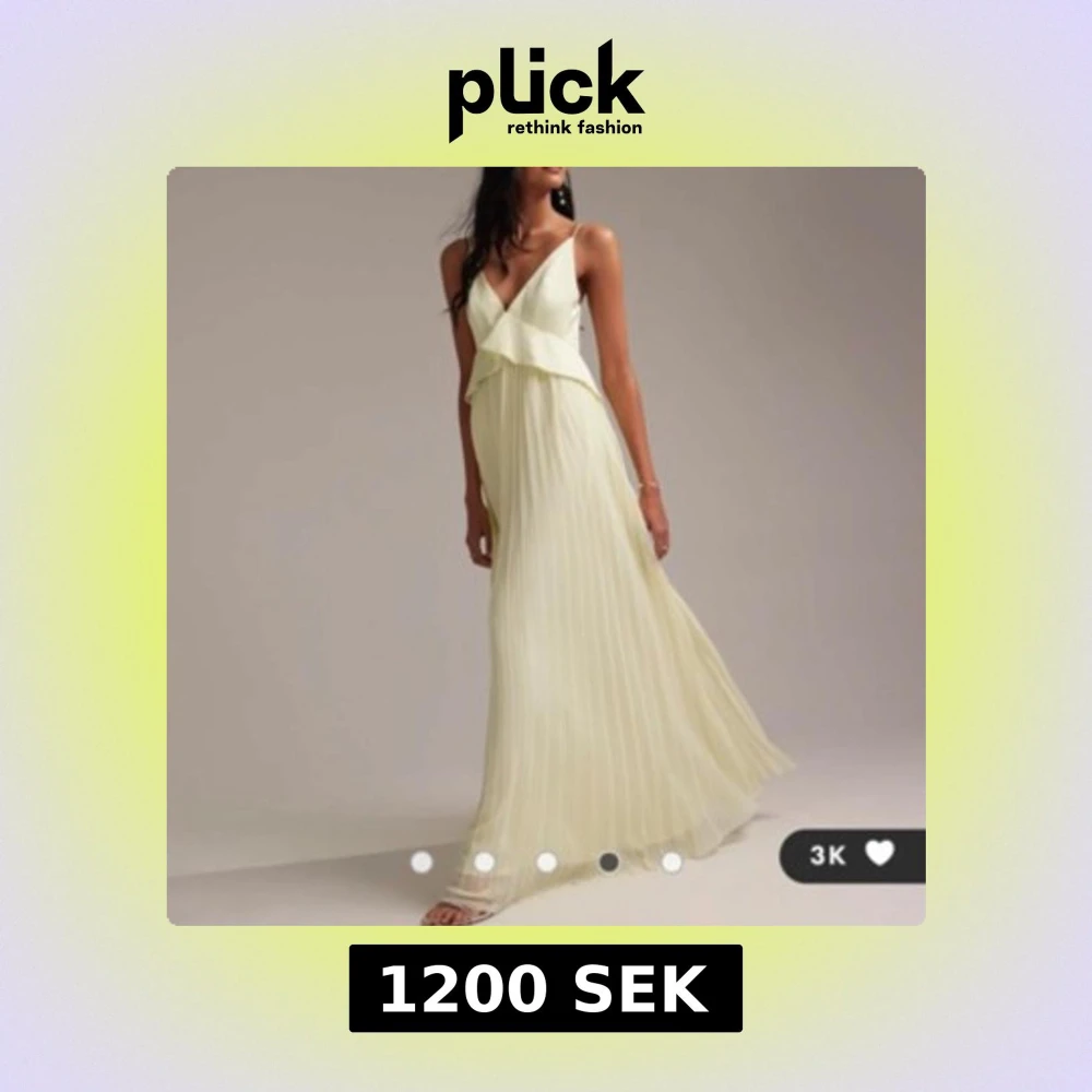 Säljer en ljusgul balklänning/tärnklänning med smala axelband och v-ringning. Klänningen har en volangdetalj över bysten och är plisserad i kjolen. Nyskick och perfekt till bal och bröllop. Jättefin smörgul färg!