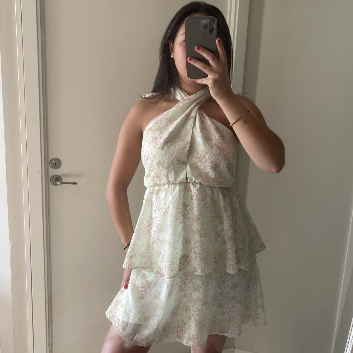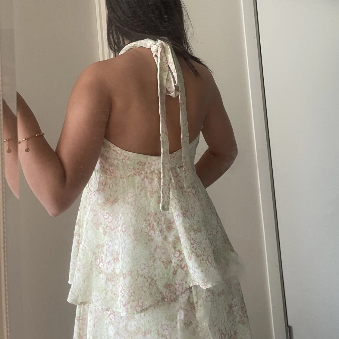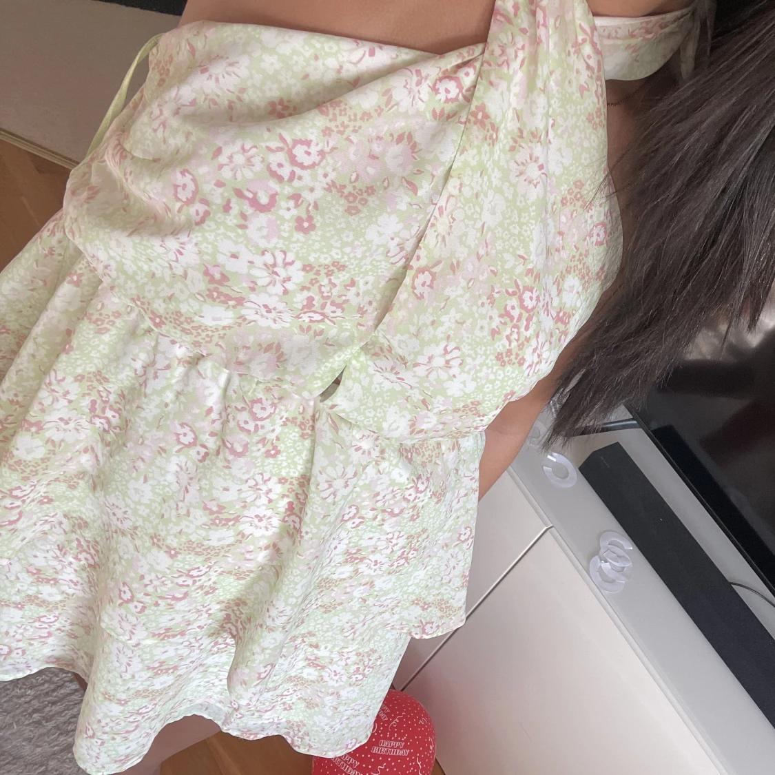 Jättesöt blommig klänning som går att knyta på två olika sätt, oanvänd med lapp kvar. Perfekt till midsommar, skolavslutning, osv. Klänningen är liite grönare i verkligheten. 👗💝💞💕