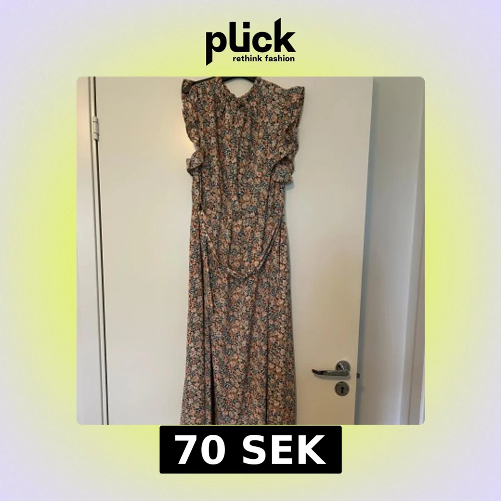 Säljer en maxiklänning med blommigt mönster i orange, beige och svart. Klänningen har volangdetaljer vid axlarna, rund hals med knapp i nacken och ett mjukt fall. Perfekt för dig som gillar romantisk stil och vill sticka ut med färg och mönster.