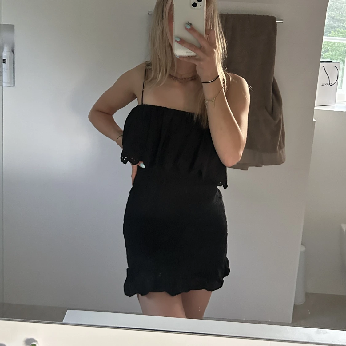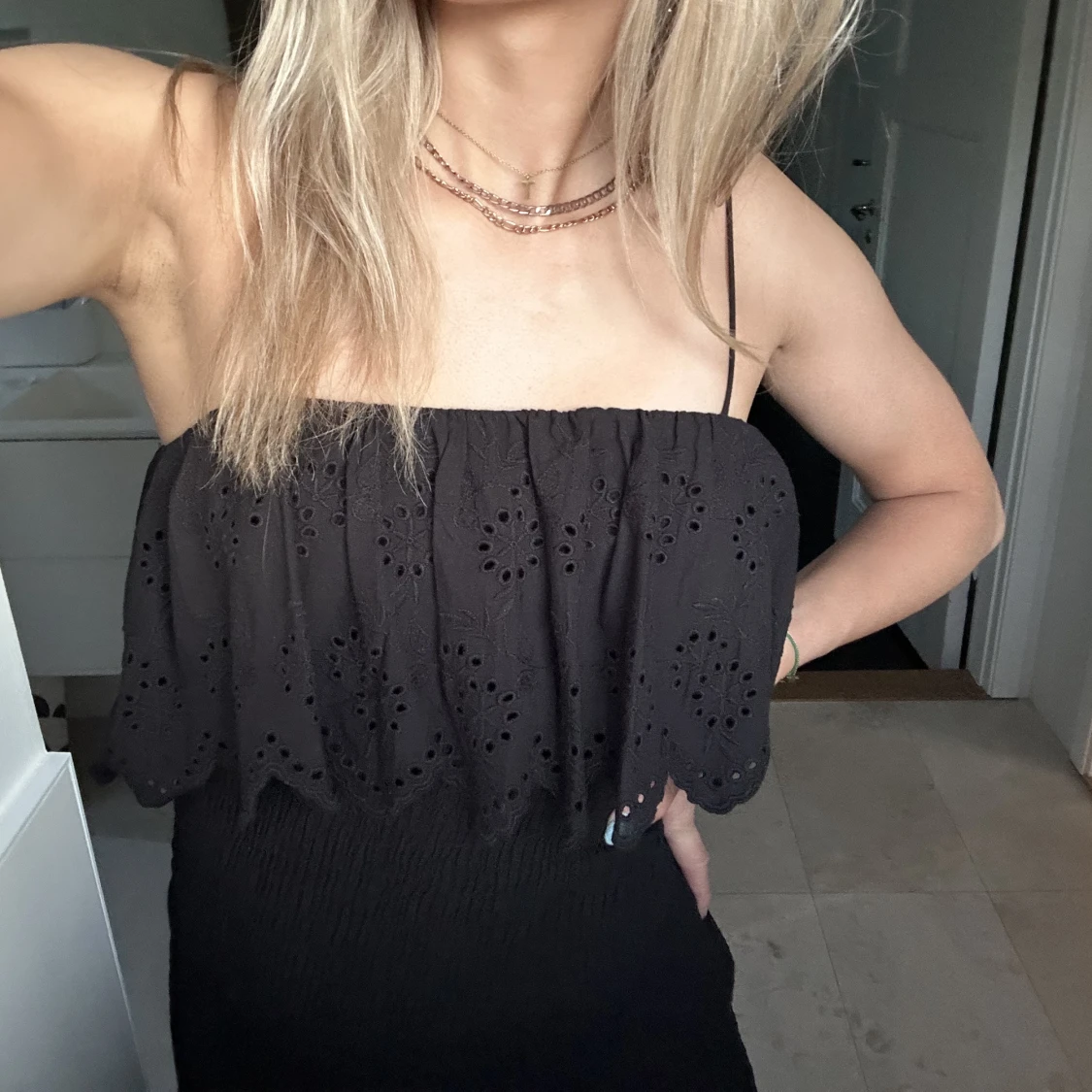 Jättegullig svart smockad klänning från zara. Stor volang upptill och liten volang längst ner.🤍🤍