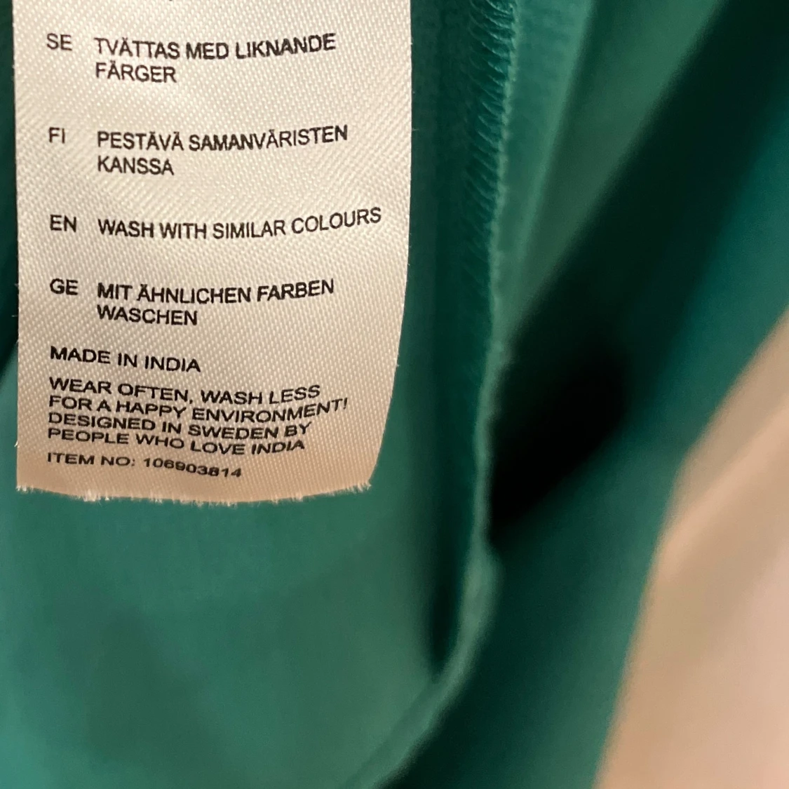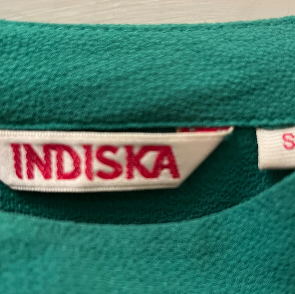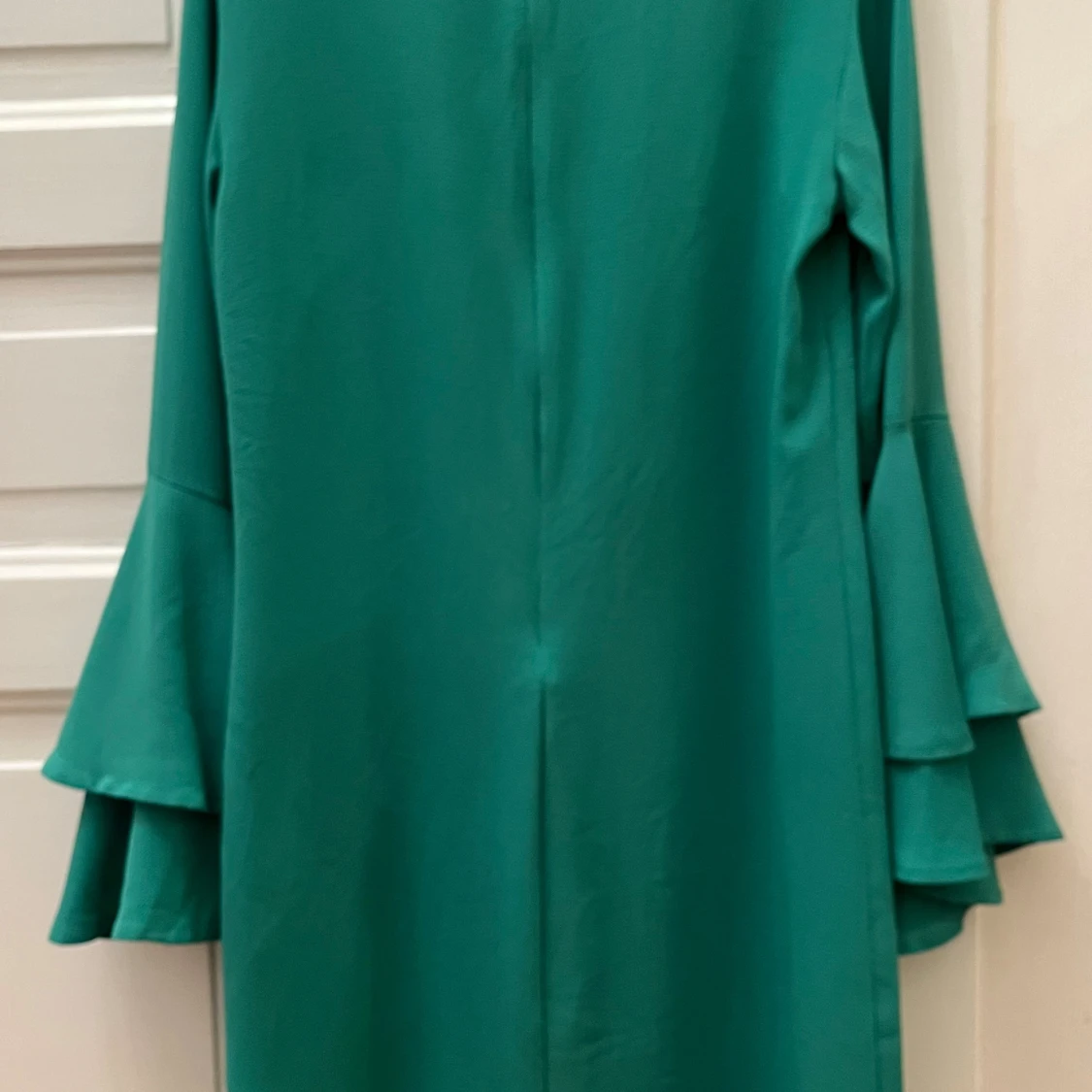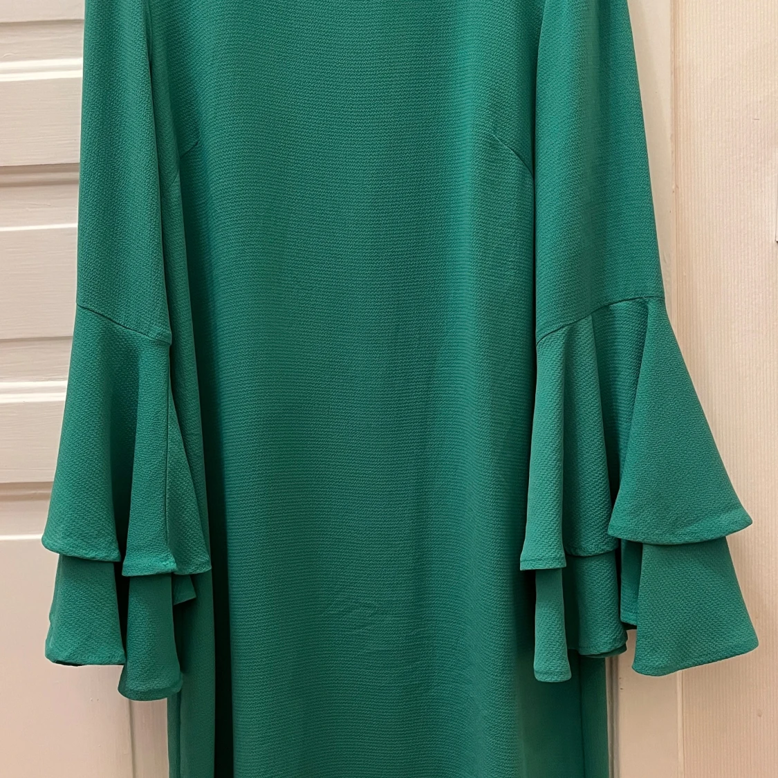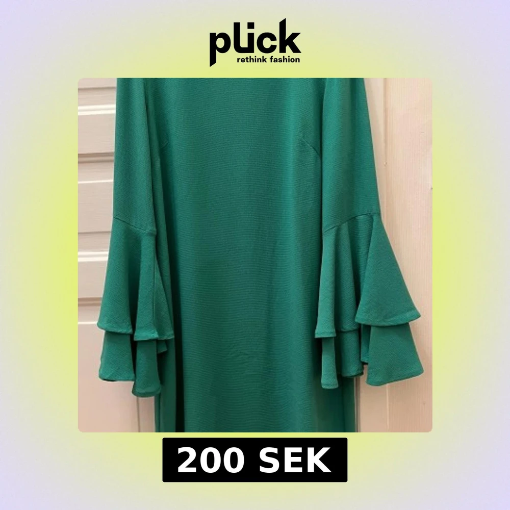 Supersnygg grön klänning från Indiska med långa ärmar och dubbla volanger vid ärmsluten. Rak passform och enkel design utan mönster, perfekt för dig som gillar statement-ärmar. Materialet känns mjukt och har lite struktur.