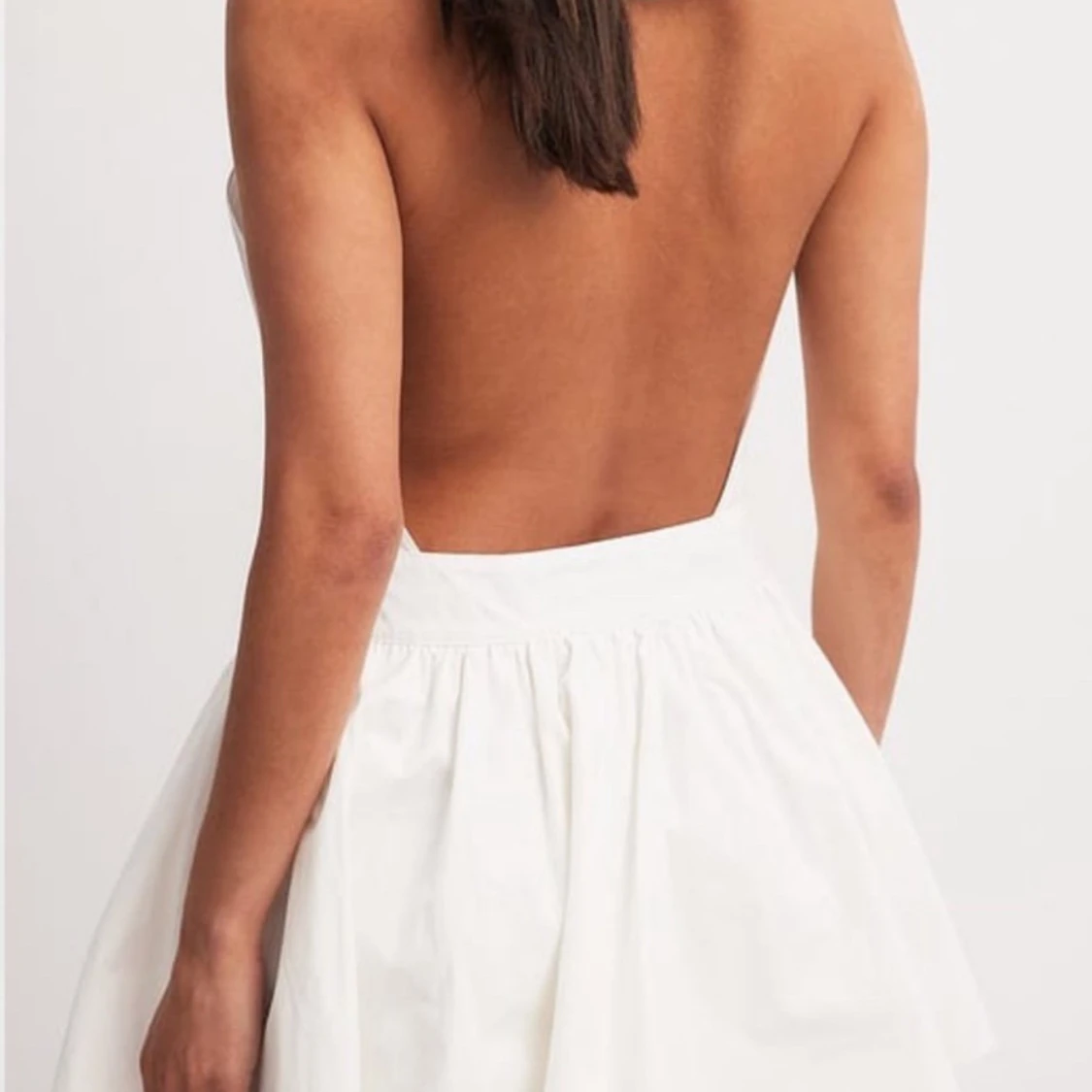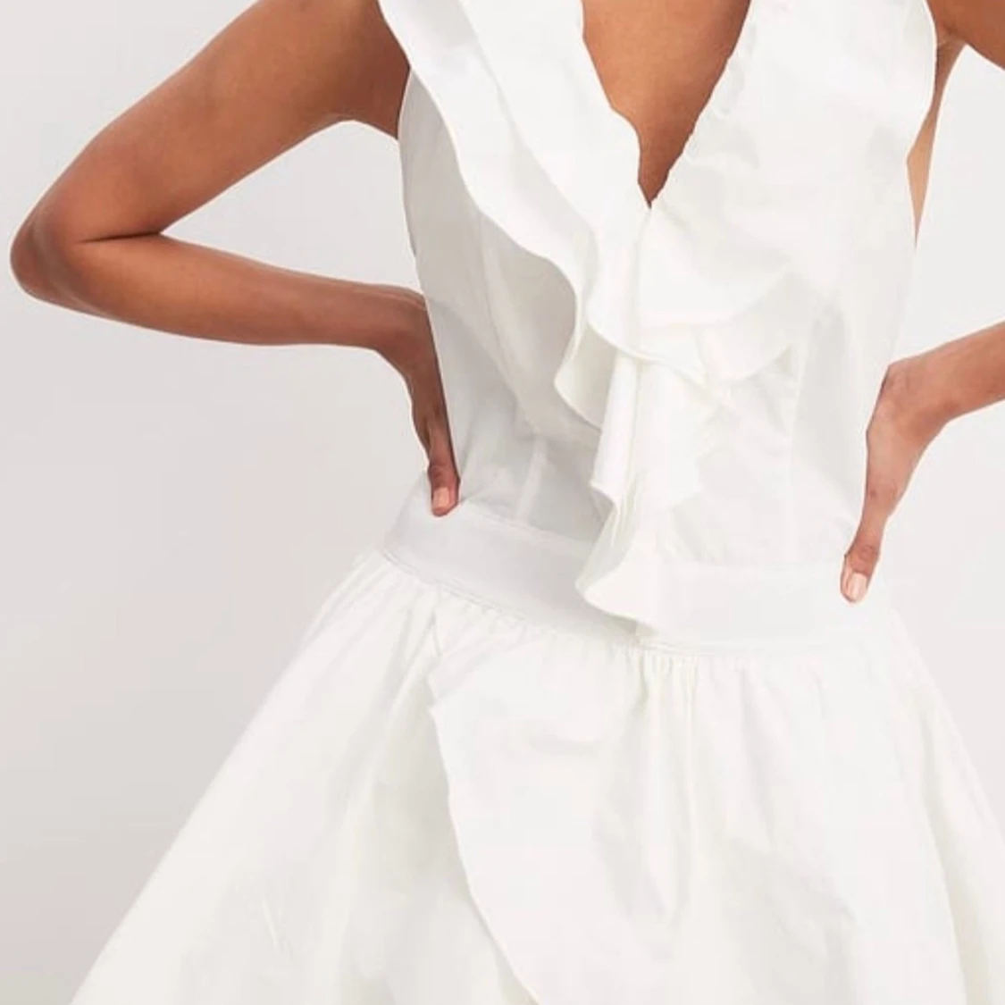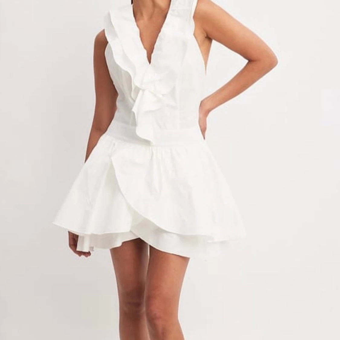 Supersöt vit kortklänning med omlottvolang framtill och djup v-ringning. Klänningen är ärmlös och har en öppen rygg som ger en extra snygg touch. Kjolen är voluminös och har lager på lager-effekt. Perfekt för dig som gillar en fräsch och trendig look.
