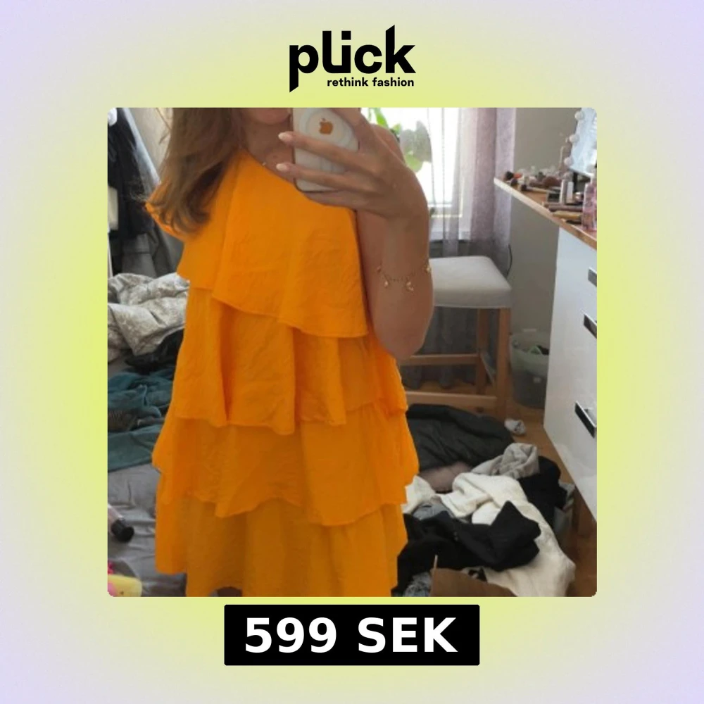 Säljer denna superfina orange klänningen med flera volanger och oneshoulder-design. Perfekt till sommaren! Säljer då den är lite för stor för mig. Köpte från Åhléns.
