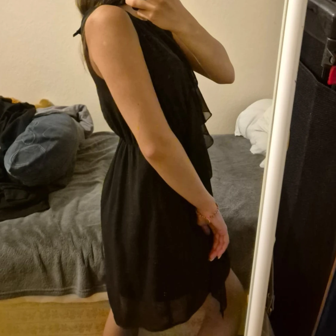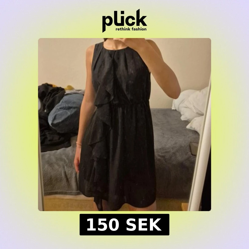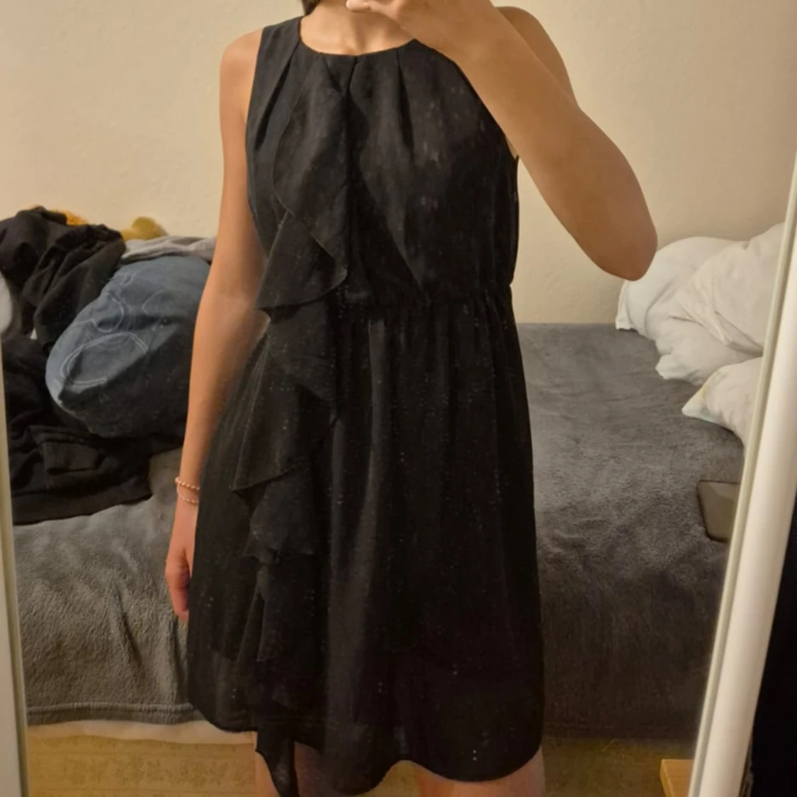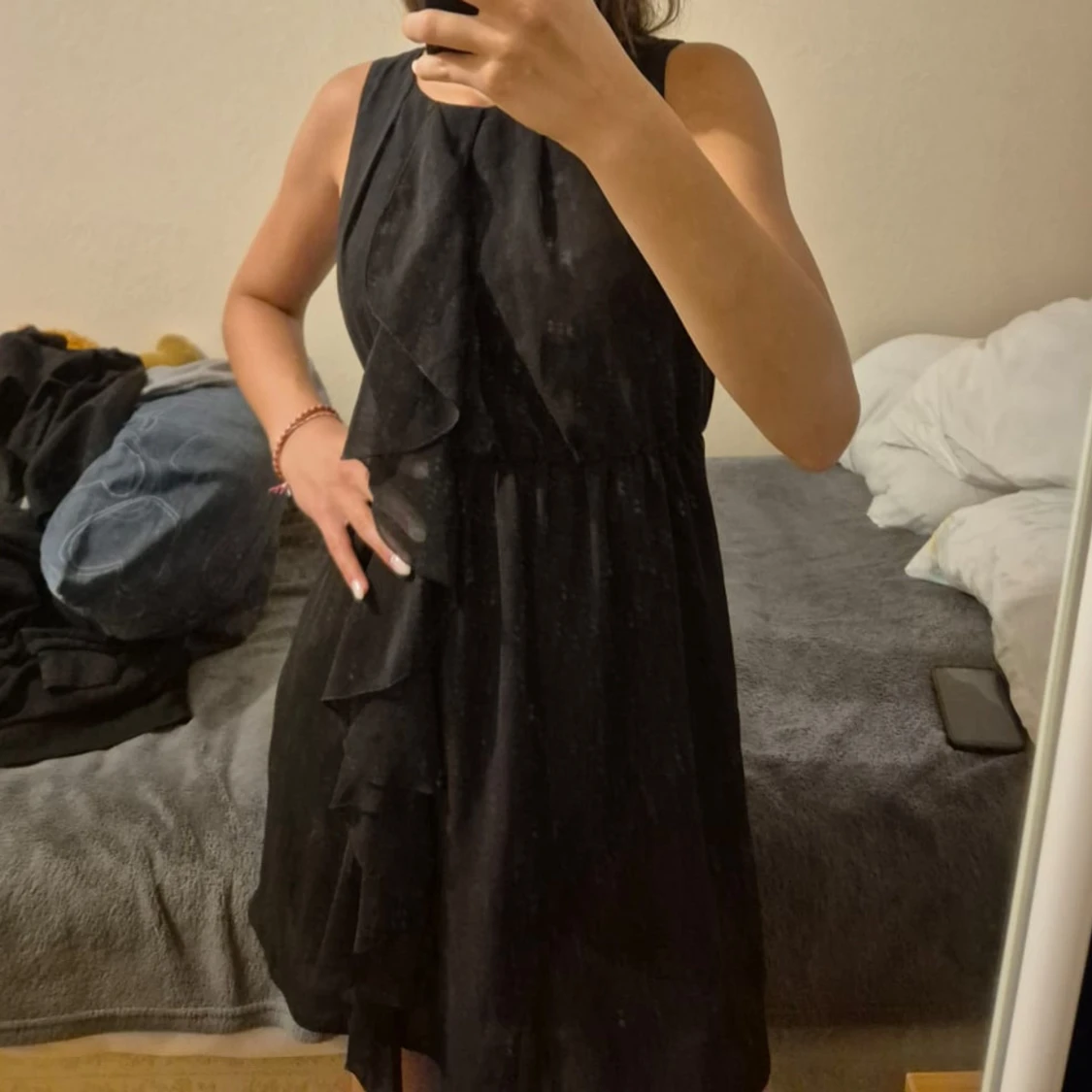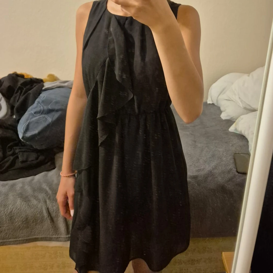 Snygg svart kortklänning med volangdetaljer framtill och markerad midja. Klänningen är ärmlös och har en lätt, luftig känsla som passar perfekt för varmare dagar. Enkel och stilren design som är lätt att matcha med accessoarer.