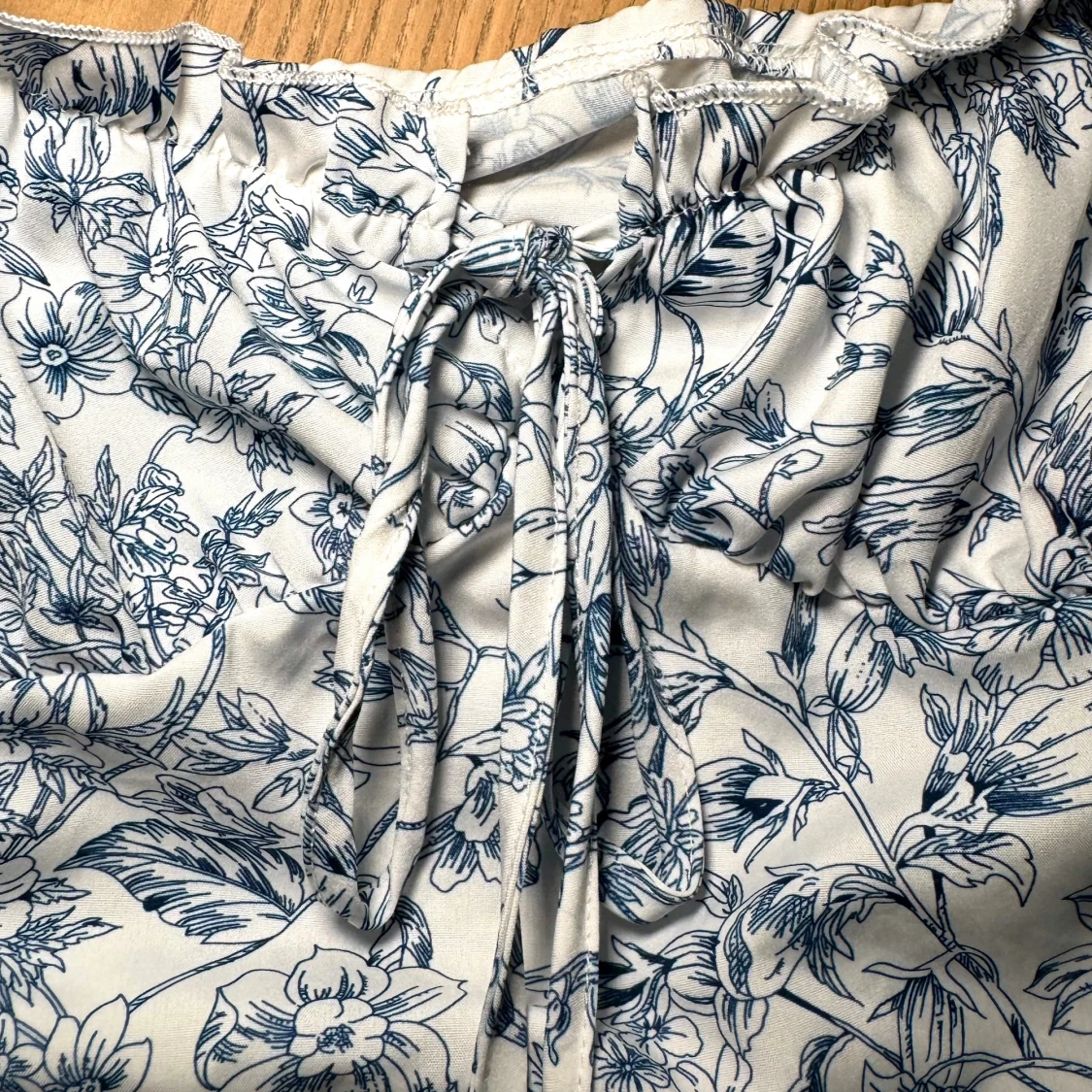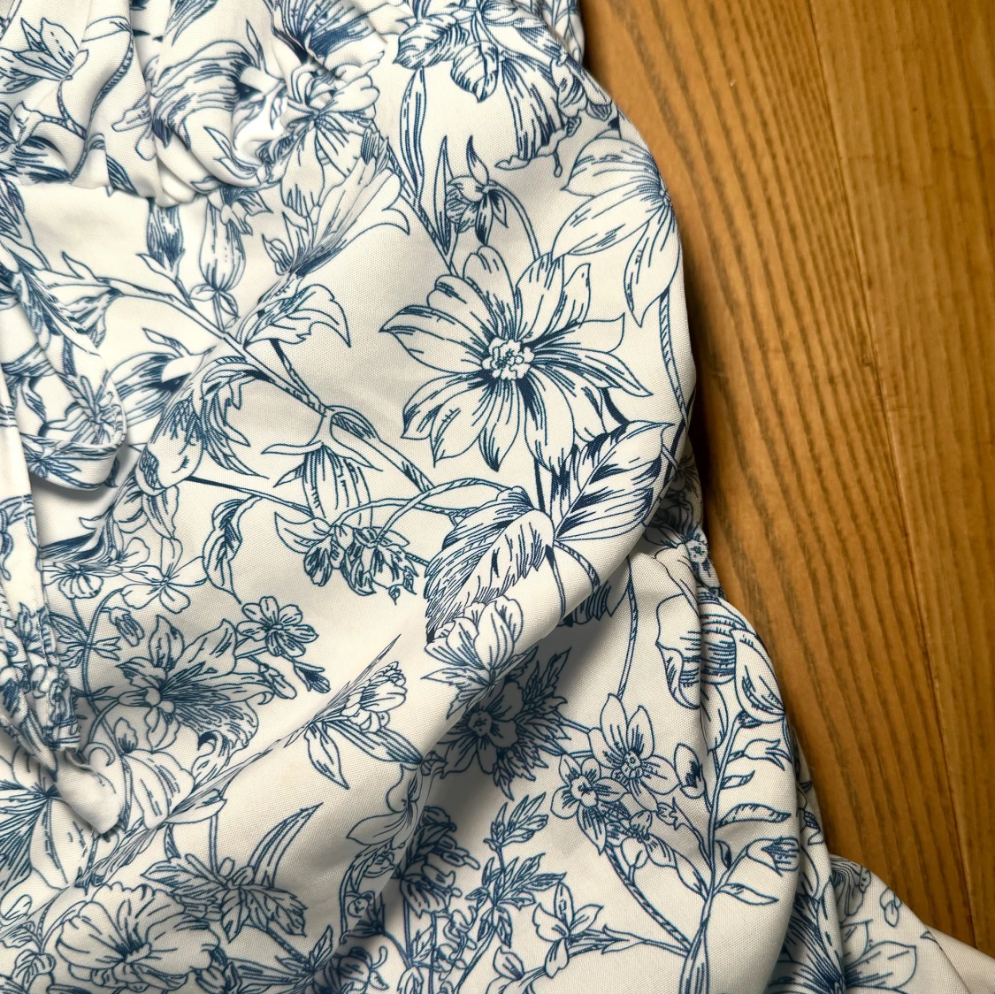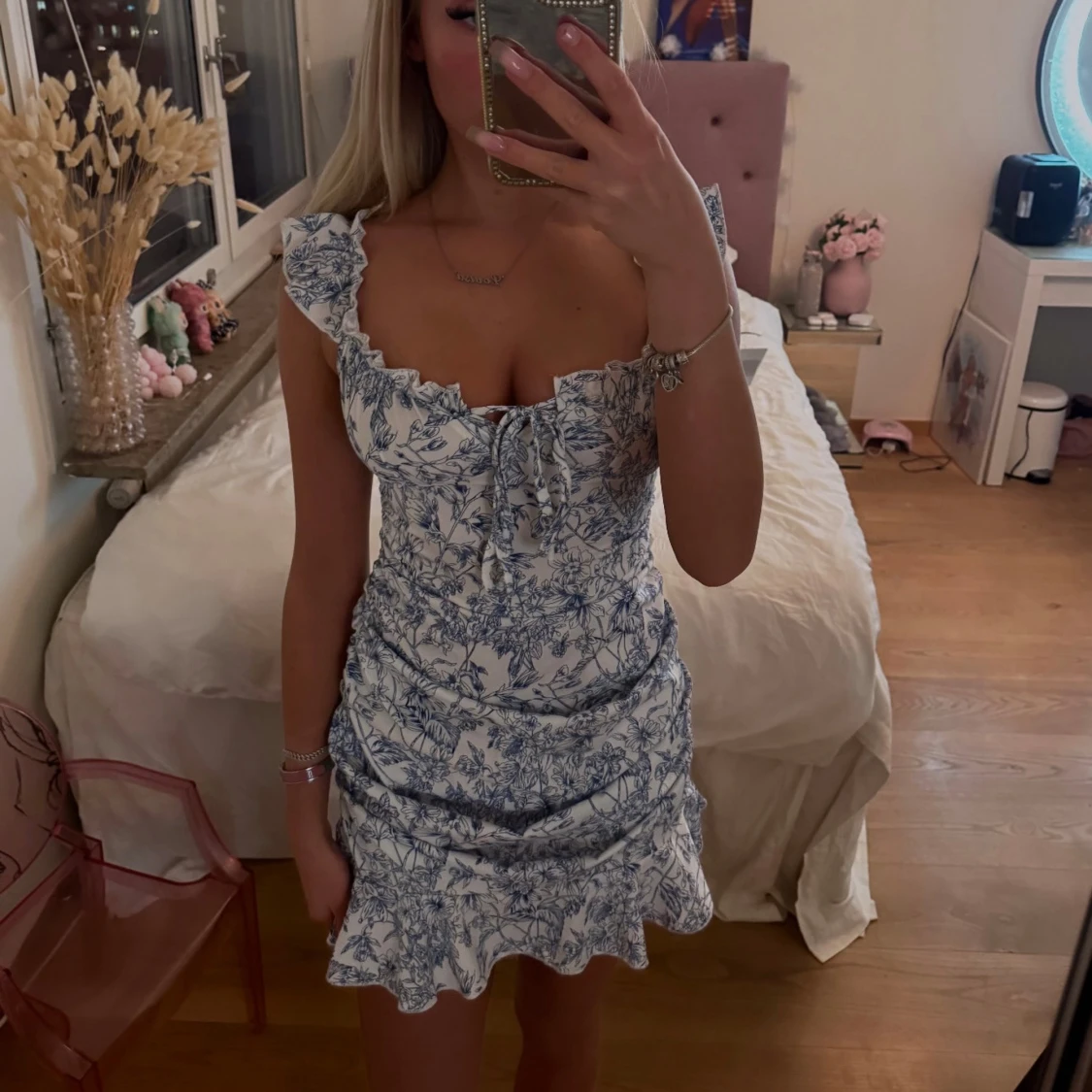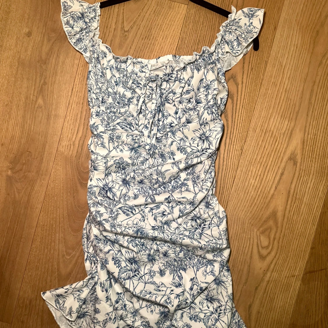 Vit och blå blommig klänning från Shein, aldrig använd 🤍 Söt sommarklänning med volangärmar, liten rosett framtill och lätt rynkad passform som sitter jättefint på. Perfekt till sommardagar eller semestern <3 - Passar XS Skriv privat för fler bilder eller frågor 🫶🏽