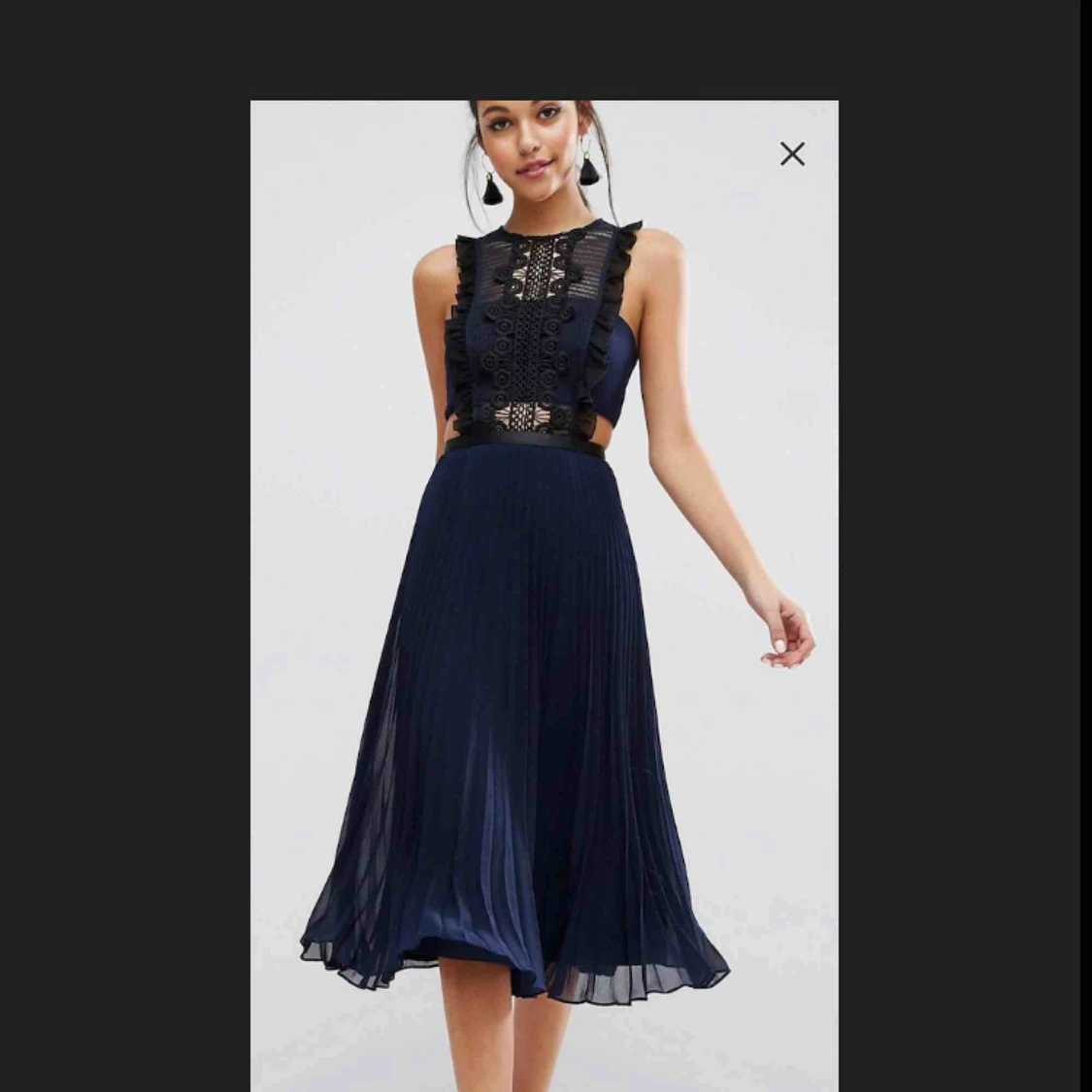 Väldigt fin midiklänning, passar perfekt för bröllop och fest. Mörkblå med svarta virkade detaljer. Knäppning med dragkedja. Oanvänd med tagg kvar. Nypris: 800kr *Obs! Första bilden är från hemsidan.