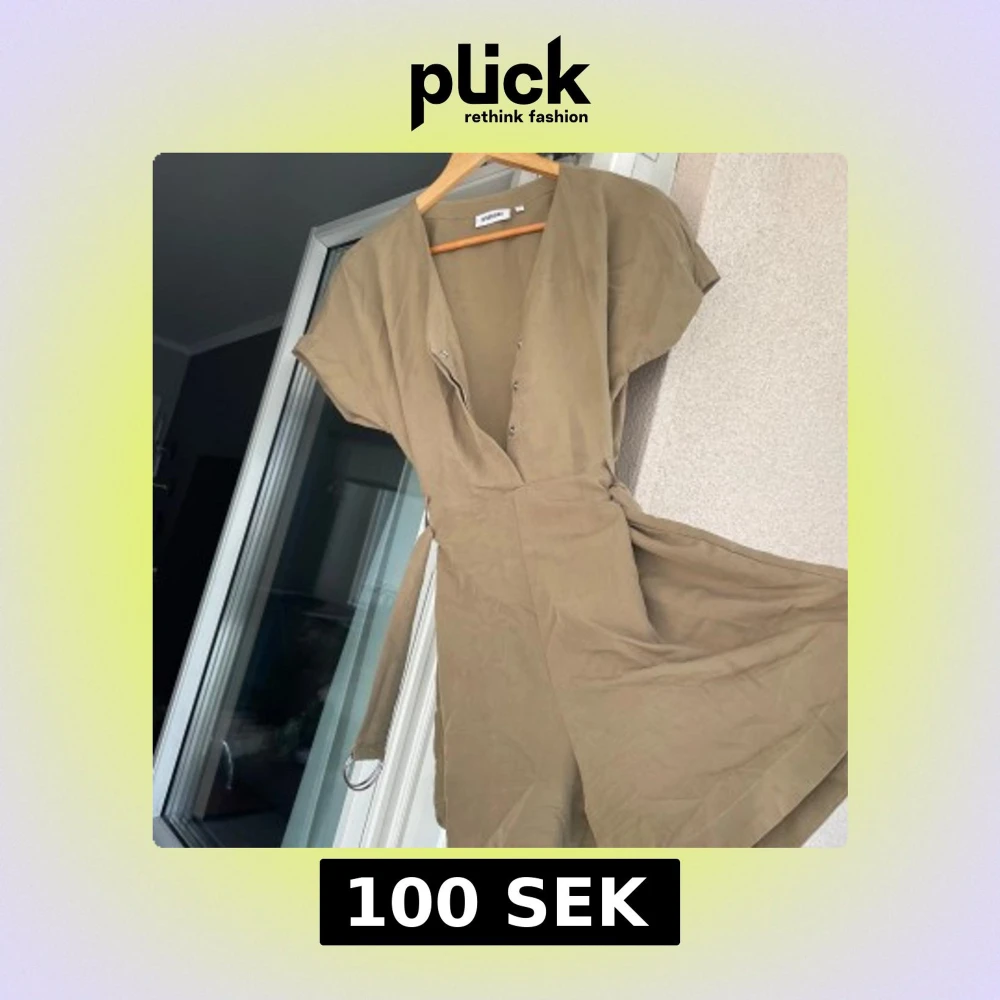 Säljer en stilren beige/mossgrön klänning från Weekday. Klänningen har en v-ringad design med korta ärmar och knappar framtill. Använt fåtal gånger och därför i mycket bra skick.