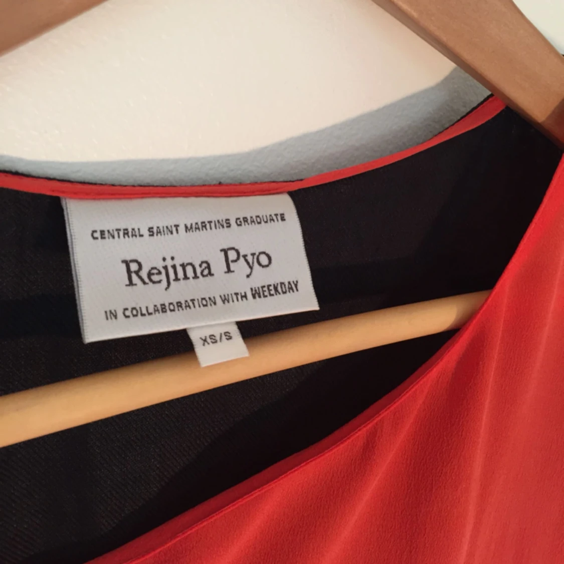 Klänning i skirare tyg på framsidan (ganska genomskinlig) och tjockare på baksidan. Weekday-samarbete med Rejina Pyo. Några år på nacken, men väldigt bra skick. Storleken är xsmall/small men funkar finfint på mig som är medium.