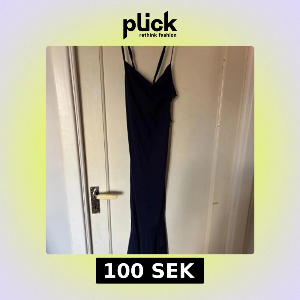Säljer en mörkblå långklänning med smala korsade axelband. Klänningen har en figurnära passform och volangdetalj framtill.