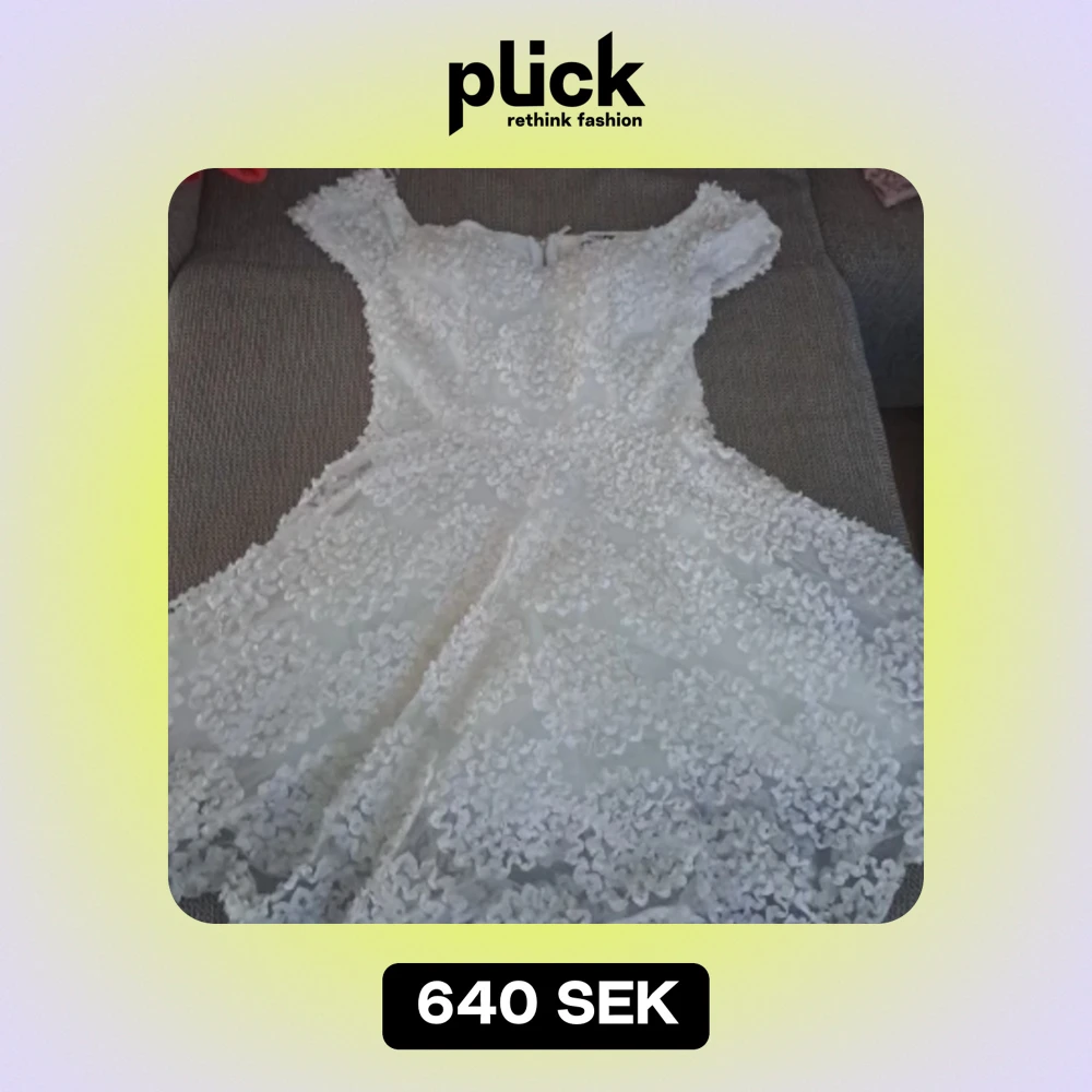 En vacker vit klänning med spetsdetaljer och blommönster. Klänningen har korta ärmar och en dragkedja på baksidan. Perfekt för festliga tillfällen. jag hade den till studenten 🥰