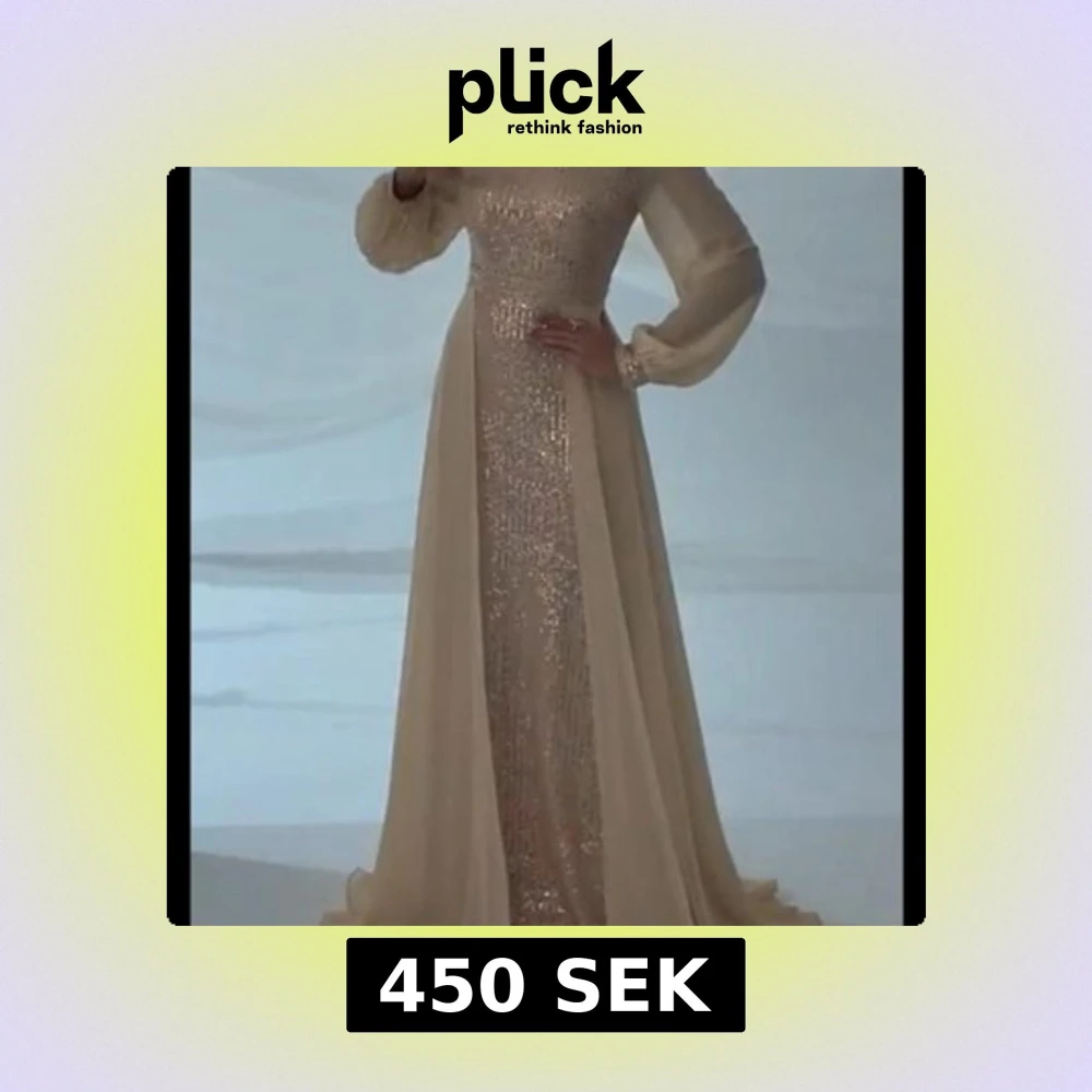 Magisk långklänning i champagne med glittriga paljetter framtill och transparenta, vida ärmar. Klänningen har en elegant, figurnära passform och ett svepande ytterlager som ger extra lyxig känsla. Perfekt för dig som vill sticka ut på nästa stora event.