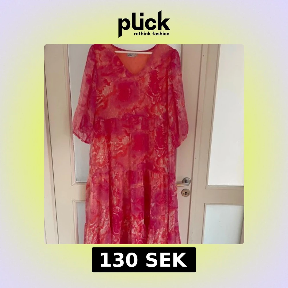 Säljer en flowy långklänning från Isolde i storlek XL. Klänningen har ett coolt abstrakt mönster i olika rosa och koralltoner, v-ringad hals och halvtransparenta, luftiga ärmar. Perfekt för dig som gillar färg och vill sticka ut med en unik look.