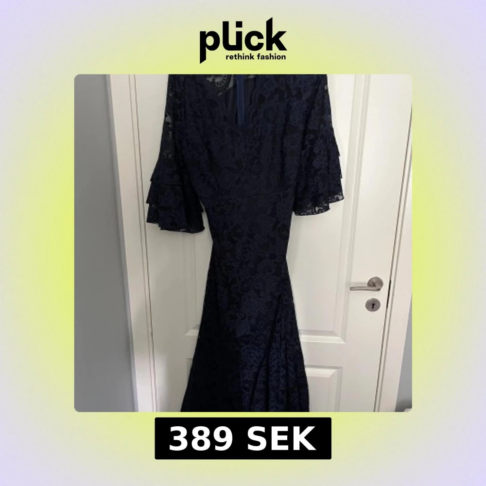 Elegant marinblå långklänning med vackert spetsmönster och vida volangärmar. Klänningen har en figurnära passform upptill och faller snyggt längs kroppen. Perfekt för festliga tillfällen där du vill sticka ut med stil.