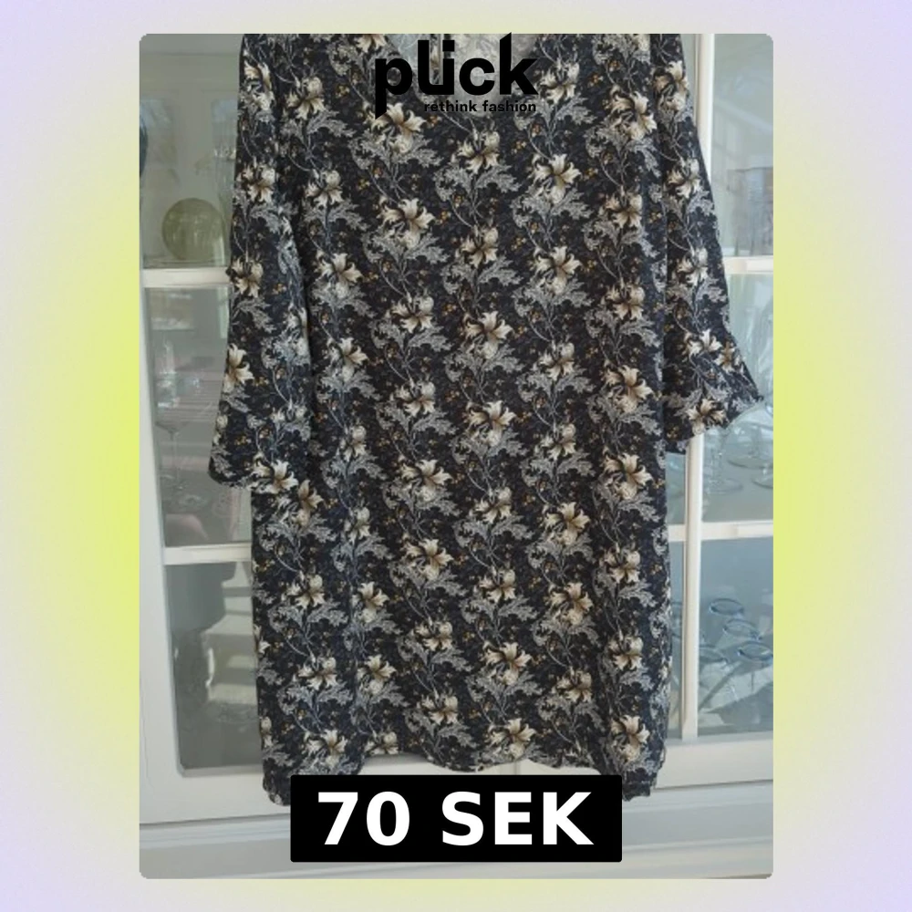 Säljer en klänning med v-ringning och blommigt mönster i vitt och beige. Klänningen/tunikan har trekvartsärm och en lös passform, perfekt för dig som gillar en avslappnad stil. Materialet känns mjukt och bekvämt, troligen bomull eller polyester.