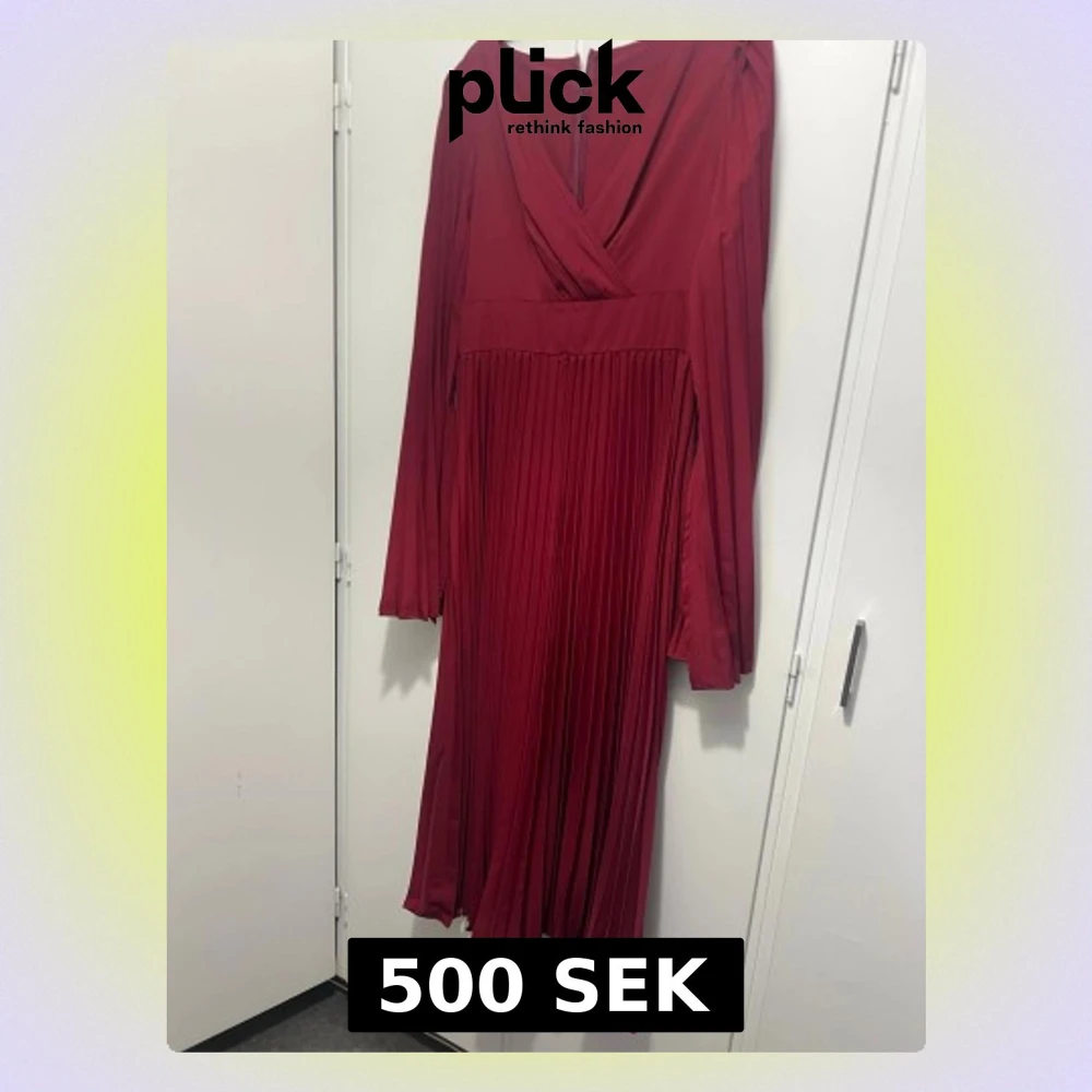 Snygg vinröd långklänning med plisserad kjol och långa ärmar. Klänningen har omlott upptill och vacker v-ringning. Tillverkad i ett glansigt material som ger en elegant look. Perfekt för dig som vill sticka ut med stilrena detaljer.