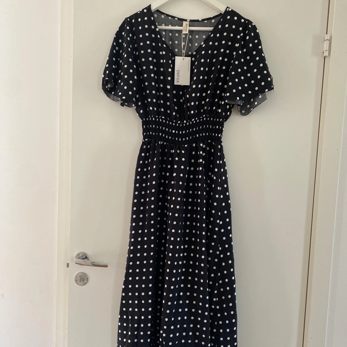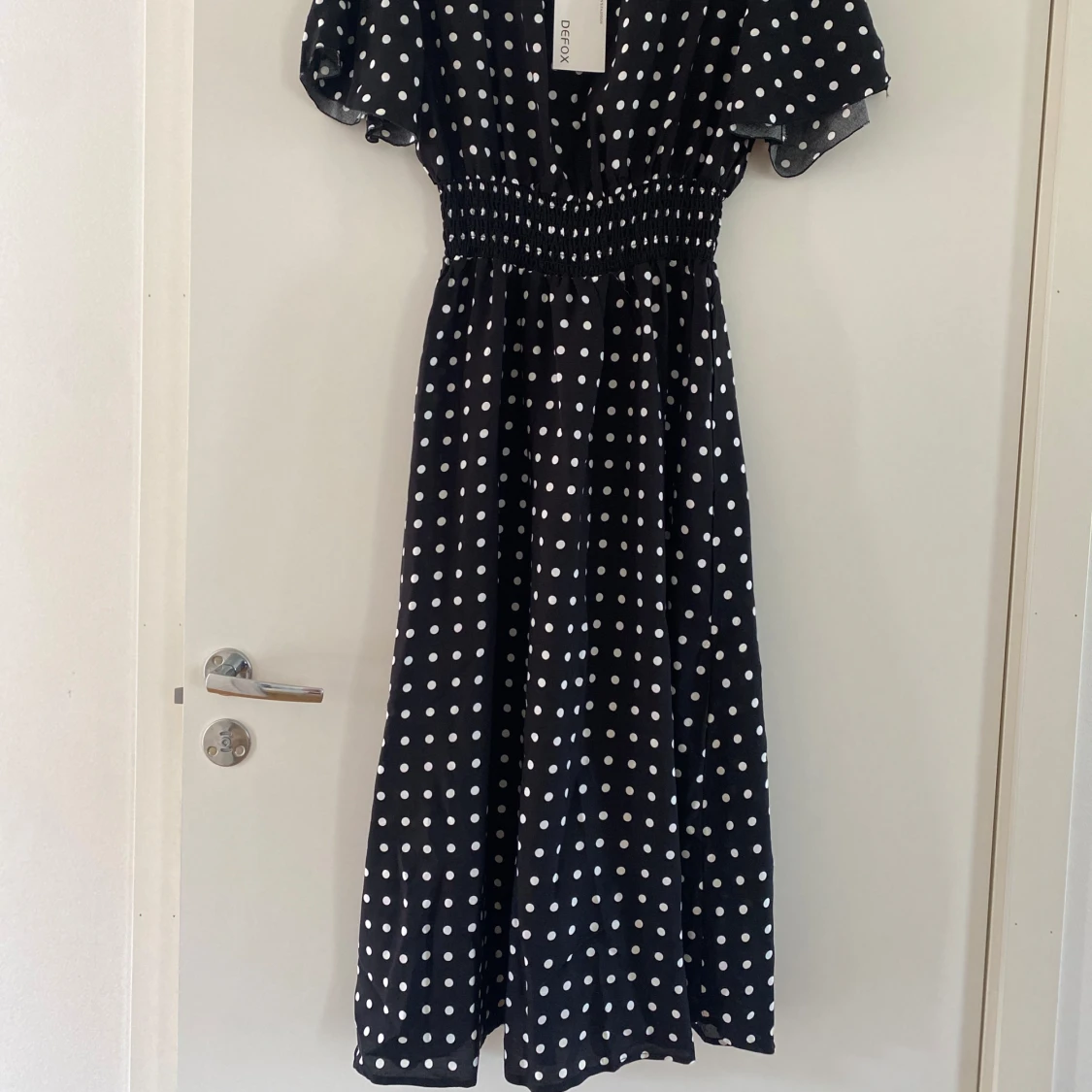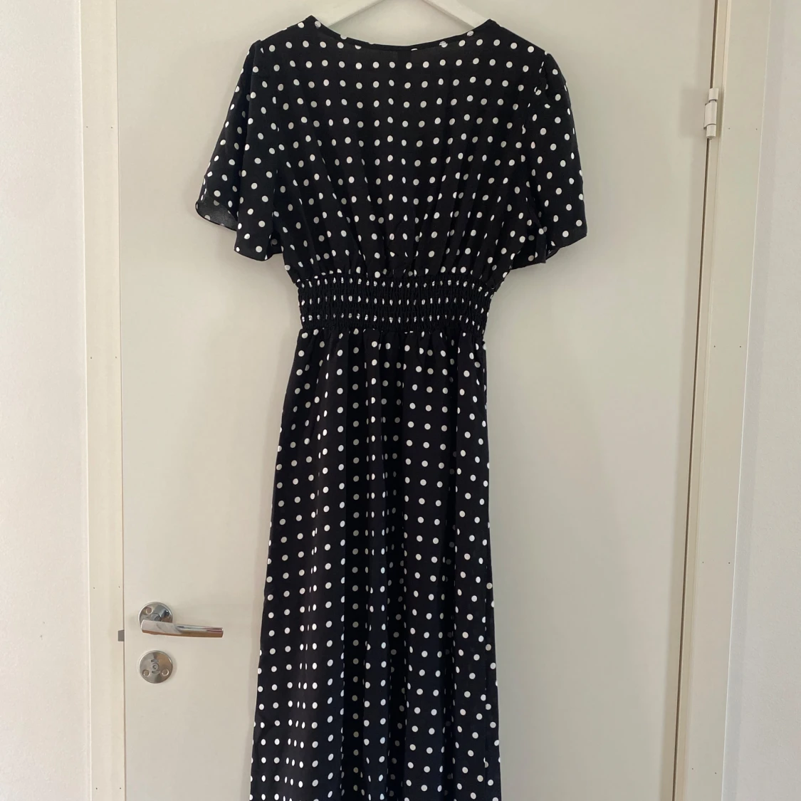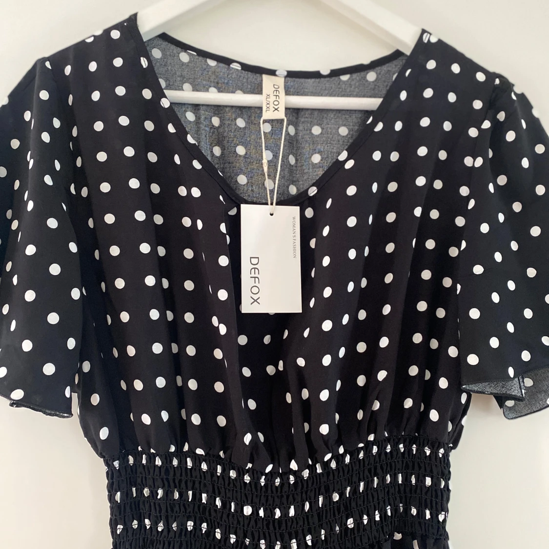 Supersöt svart långklänning från Defox med vita prickar, v-ringning och korta, korta ärmar. Smockad midja ger en snygg siluett och klänningen har ett flowigt fall. Perfekt för dig som gillar retrovibbar och vill sticka ut med ett klassiskt mönster. Ny med prislappen kvar.