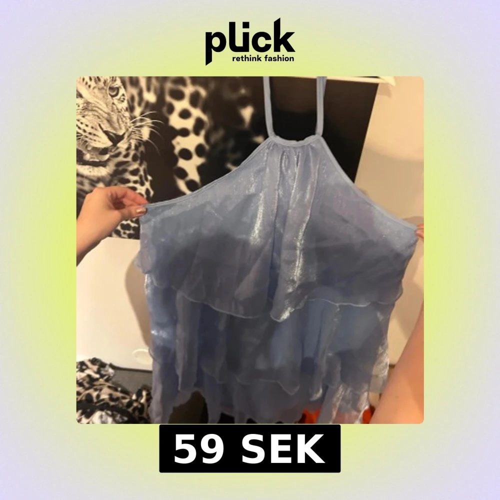 Supersöt ljusblå klänning med flera lager volanger och tunna knytband i nacken. Klänningen är ärmlös och har en glansig, lätt transparent look som ger en drömmig känsla. Perfekt för dig som vill sticka ut med en romantisk och luftig stil.