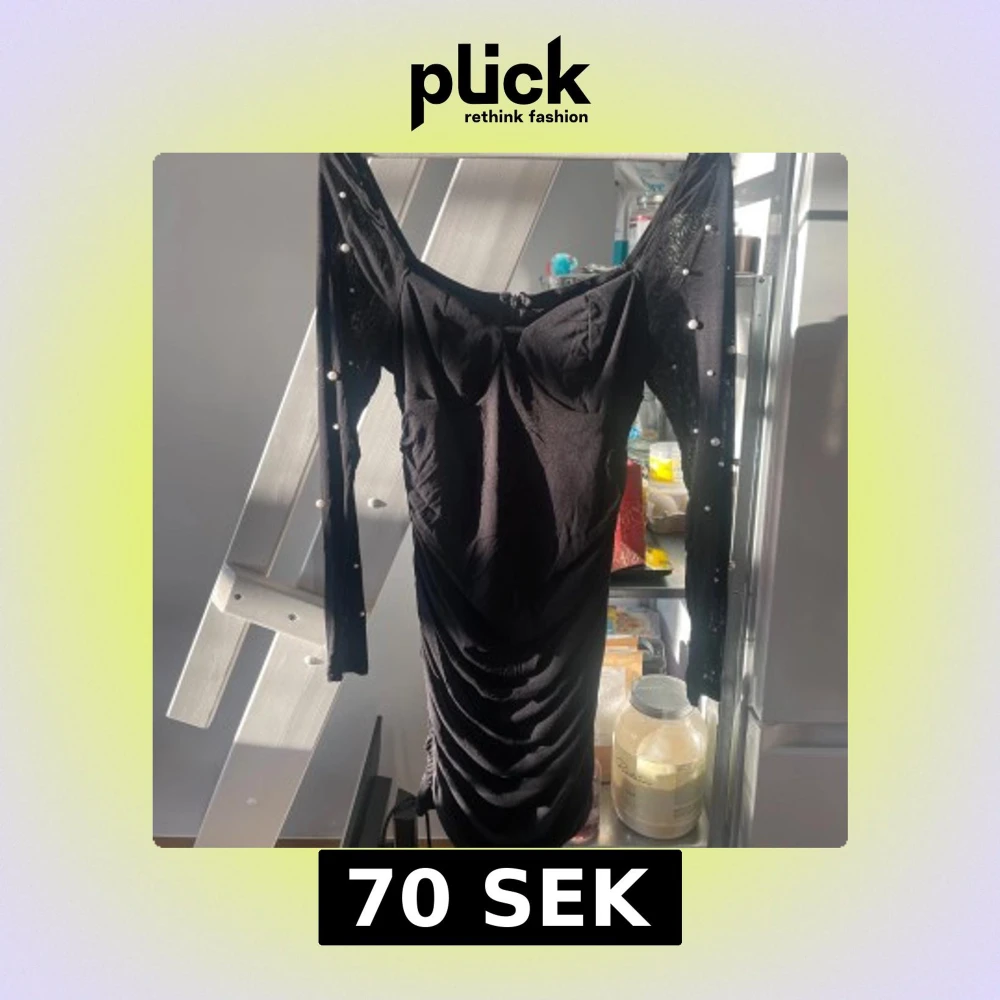 Säljer en svart, tight klänning med långa meshärmar dekorerade med pärlor. Klänningen har rynkade detaljer framtill. Användes en kväll på nyår enbart! Står strl 1XL, passar en L-XL.