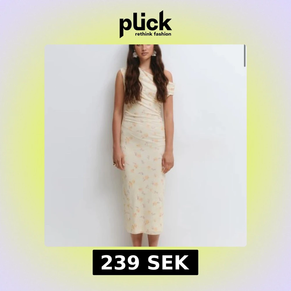 Nypris 500! ✨ Säljer en ljus, axelbandslös omlottklänning med blommigt mönster i mjuka pastellfärger. Klänningen har en oneshoulder-design och är figurnära med draperade detaljer. Perfekt för dig som gillar romantisk och feminin stil.