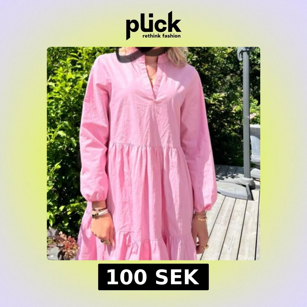 Söt ljusrosa klänning med v-ringning och långa ärmar. Klänningen har volanger och en luftig, lös passform som ger en avslappnad och trendig look. Perfekt för varma dagar och somriga tillfällen.