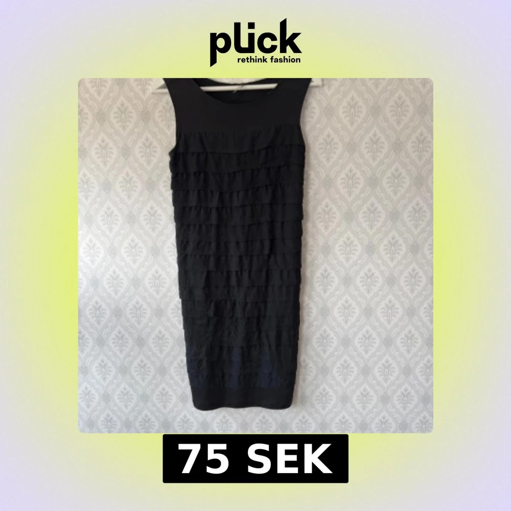 Snygg svart kortklänning från Bruuns Bazaar med ärmlös design och rund halsringning. Framsidan har flera lager av volangliknande rynkade band som ger en cool struktur. Perfekt för dig som gillar stilrena och trendiga plagg. Använd fåtal gånger. Rökfritt hem!