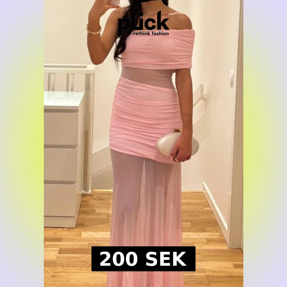 Säljer en ljusrosa långklänning med offshoulder och transparent meshdetaljer. Klänningen har rynkade partier upptill och vid höften, samt en flowy, skir nederdel. Perfekt för dig som vill ha en elegant och trendig look.