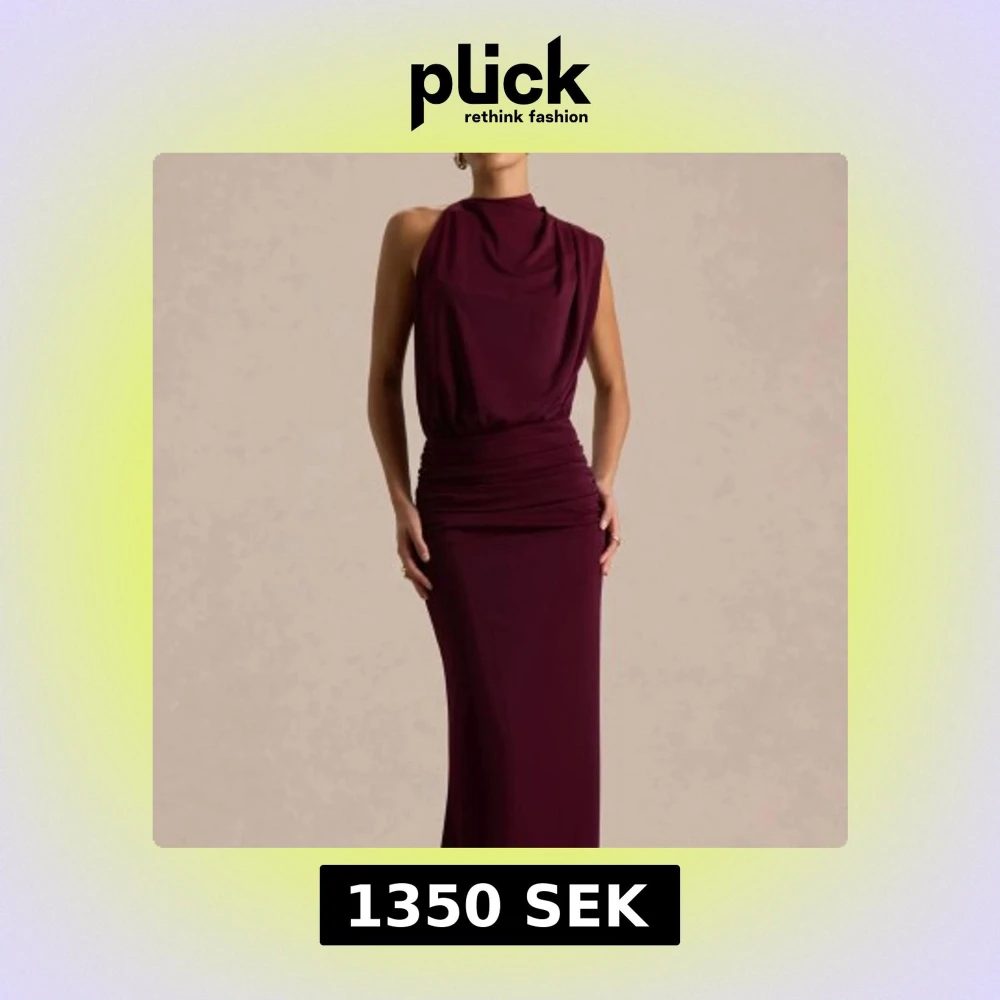 Säljer en elegant vinröd långklänning med draperad överdel och markerad midja. Klänningen har ärmlös design och hög hals, vilket ger en stilren och modern look. Perfekt för dig som vill sticka ut med en sofistikerad vibe.