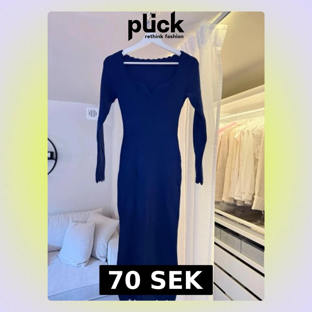 Snygg marinblå långklänning med ribbad struktur och vågig v-ringad urringning. Klänningen har lång ärm och är figurnära i modellen, perfekt för dig som gillar en stilren och enkel look. Materialet känns mjukt och stretchigt.