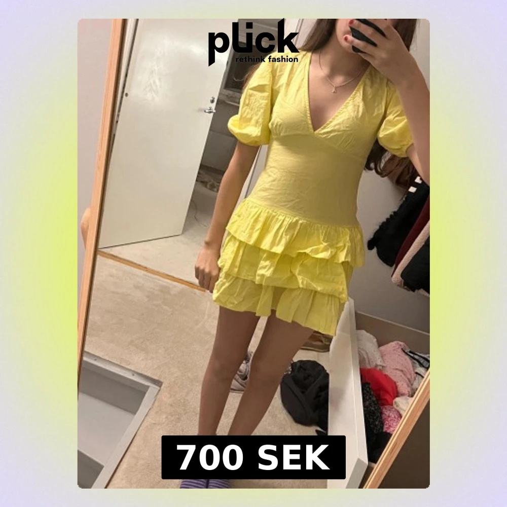 Supersöt gul klänning med volanger och puffiga korta ärmar. Klänningen har en djup v-ringning och flera lager volanger på kjolen som ger en lekfull look. Perfekt för dig som gillar färg och vill sticka ut. Materialet känns lätt och luftigt. Kp vid behov av mer bilder!
