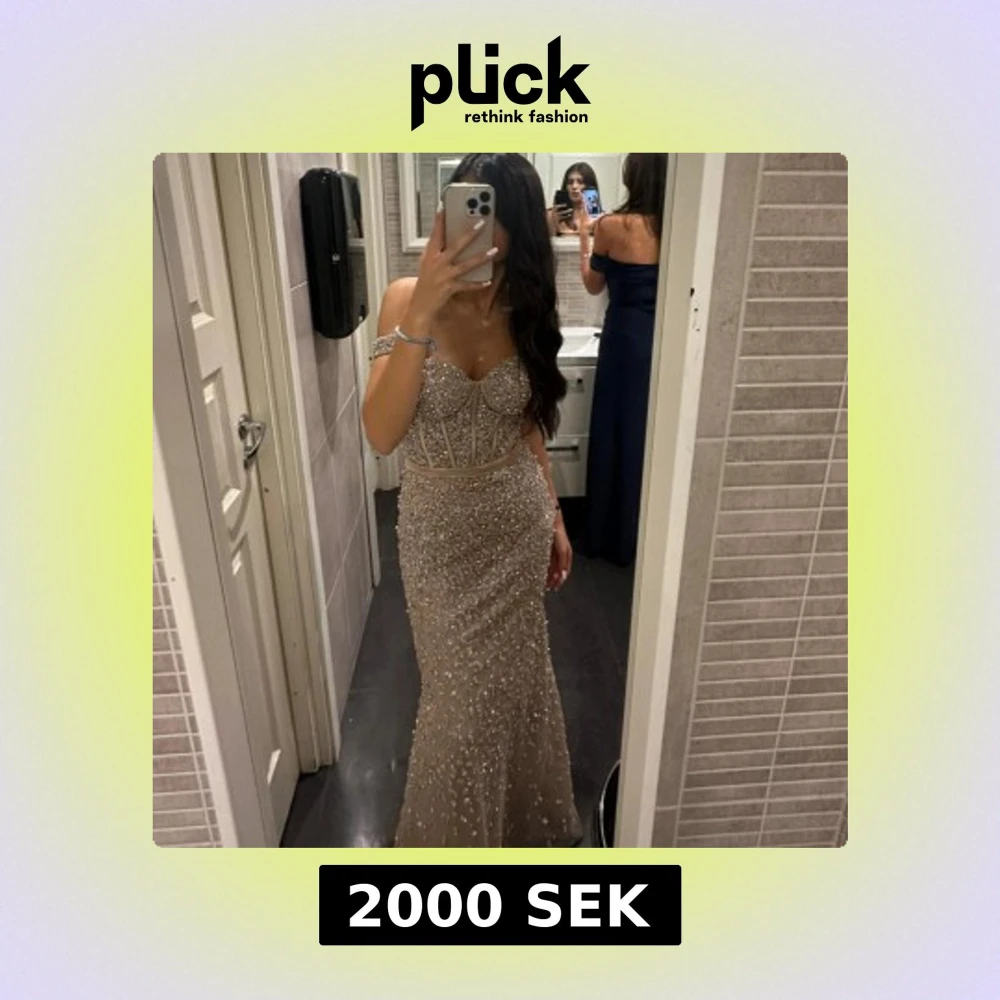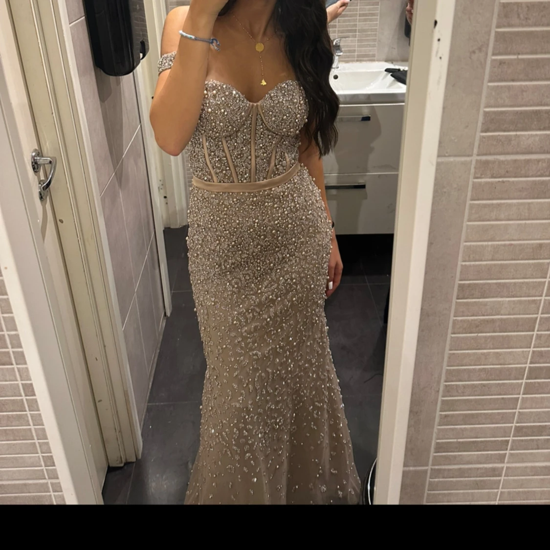 De är en balklänning som jag hade i en förlovning. Jätte fin på sitter som den ska. Däremot är den ganska tung pga all små detaljer som sitter på. Är i storleken Xs köp för 4000kr och de kommer med en vale som sitter på midjan av klänningen