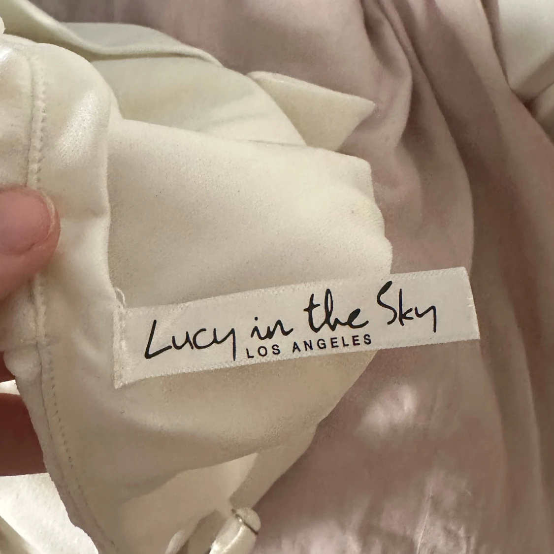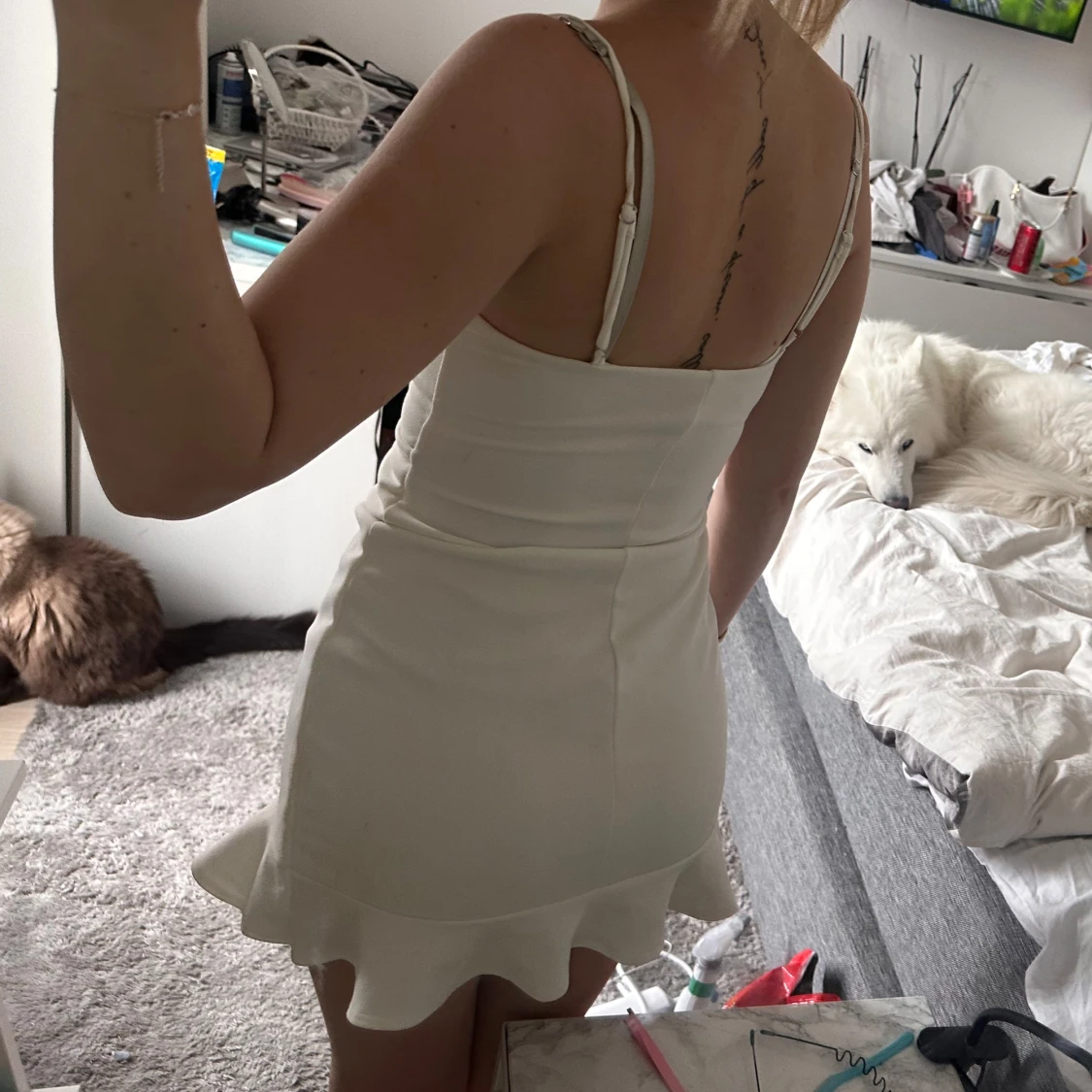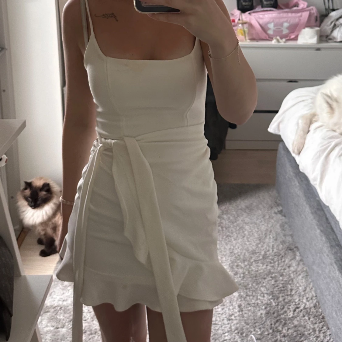 Supersöt vit kortklänning från Lucy in the Sky med justerbara smala axelband, omlottknytning i midjan och volangkant nedtill. Klänningen har en clean look och sitter snyggt med figurnära passform. Perfekt för dig som gillar stilrena och trendiga plagg. Pris kan diskuteras