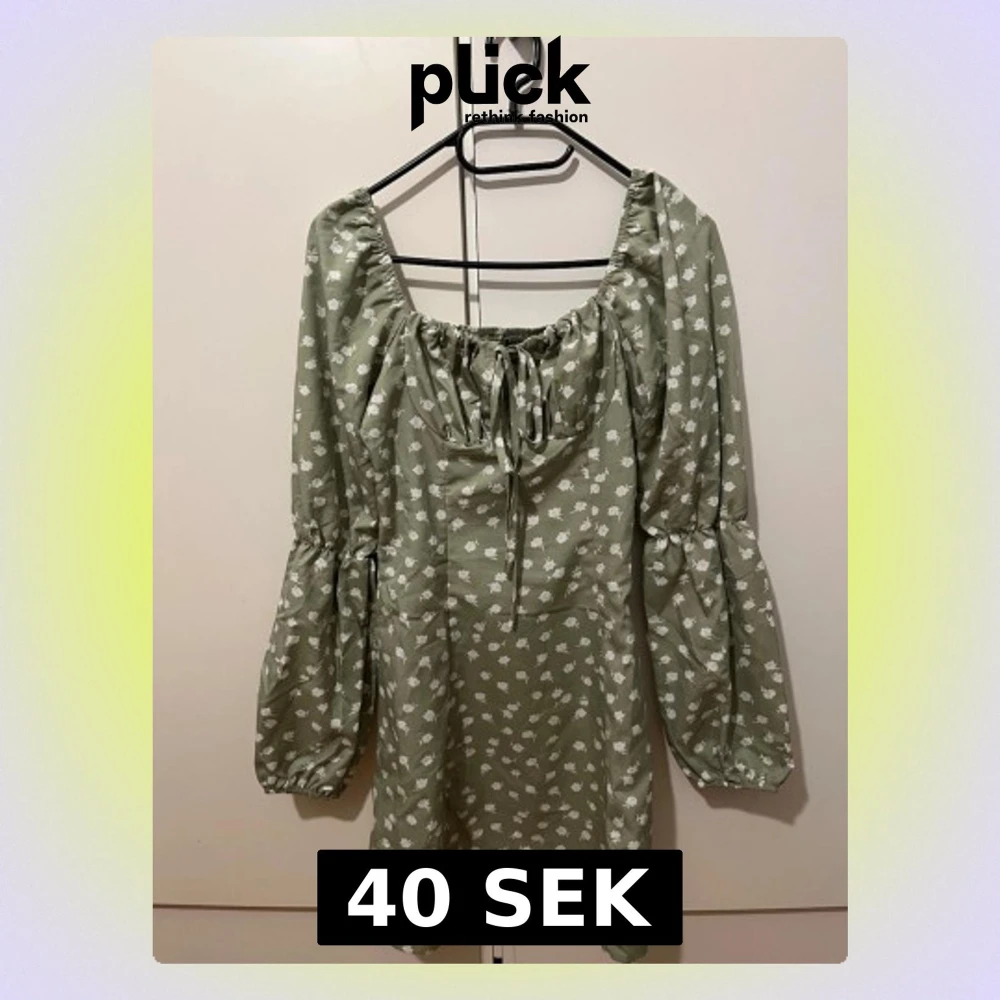 Säljer en söt grön kortklänning från SHEIN i storlek XS. Klänningen har vita blommor, långa puffärmar och en snygg snörning vid halsen. Endast använd vid ett fåtal tillfällen.